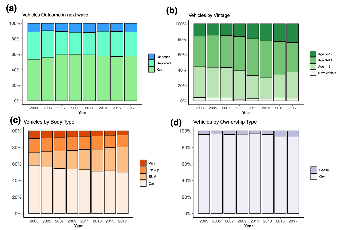 What makes you hold on that old car? While the vast majority of the household vehicles are still powered by conventional internal combustion engines, the progress of adopting emerging vehicle technologies will critically depend on how soon the existing vehicles are transacted out of the household fleet. Leveraging a nationally representative longitudinal data set, the Panel Study of Income Dynamics, this study examines how household decisions to dispose of or replace a given vehicle are: (1) influenced by the vehicle's attributes, (2) mediated by households' concurrent socio-demographic and economic attributes, and (3) triggered by key life cycle events. Coupled with a newly developed machine learning interpretation tool, TreeExplainer, we demonstrate an innovative use of machine learning models to augment traditional logit modeling to both generate behavioral insights and improve model performance. We find the two gradient-boosting-based methods, CatBoost and LightGBM, are the best performing machine learning models for this problem. The multinomial logistic model can achieve similar performance levels after its model specification is informed by TreeExplainer. Both machine learning and multinomial logit models suggest that while older vehicles are more likely to be disposed of or replaced than newer ones, such probability decreases as the vehicles serve the family longer. We find that married families, families with higher education levels, homeowners, and older families tend to keep their vehicles longer. Life events such as childbirth, residential relocation, and change of household composition and income are found to increase vehicle disposal and/or replacement. We provide additional insights on the timing of vehicle replacement or disposal, in particular, the presence of children and childbirth events are more strongly associated with vehicle replacement among younger parents.