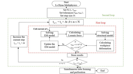 Electromagnetic forming and perforations (EMFP) are complex and innovative high strain rate processes that involve electromagnetic-mechanical interactions for simultaneous metal forming and perforations. Instead of spending costly resources on repetitive experimental work, a properly designed numerical model can be effectively used for detailed analysis and characterization of the complex process. A coupled finite element (FE) model is considered for analyzing the multi-physics of the EMFP because of its robustness and improved accuracy. In this work, a detailed understanding of the process has been achieved by numerically simulating forming and perforations of Al6061-T6 tube for 12 holes and 36 holes with two different punches, i.e., pointed and concave punches using Ls-Dyna software. In order to shed light on EMFP physics, a comparison between experimental data and the formulated numerical simulation has been carried out to compare the average hole diameter and the number of perforated holes, for different types of punches and a range of discharge energies. The simulated results show acceptable agreement with experimental studies, with maximum deviations being less than or equal to 6%, which clearly illustrates the efficacy and capability of the developed coupled Multi-physics FE model.