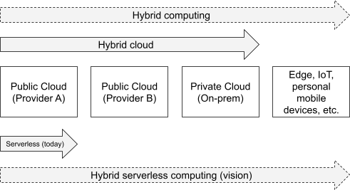 In recent years, there has been a surge in the adoption of serverless computing due to the ease of deployment, attractive pay-per-use pricing, and transparent horizontal auto-scaling. At the same time, infrastructure advancements such as the emergence of 5G networks and the explosion of devices connected to Internet known as Internet of Things (IoT), as well as new application requirements that constrain where computation and data can happen, will expand the reach of Cloud computing beyond traditional data centers into Hybrid Cloud. Digital transformation due to the pandemic, which accelerated changes to the workforce and spurred further adoption of AI, is expected to accelerate and the emergent Hybrid Cloud market could potentially expand to over trillion dollars. In the Hybrid Cloud environment, driven by the serverless tenants there will be an increased need to focus on enabling productive work for application builders that are using a distributed platform including public clouds, private clouds, and edge systems. In this chapter we investigate how far serverless computing can be extended to become Hybrid Serverless Computing.