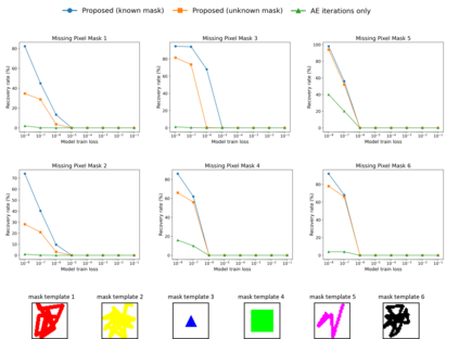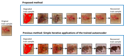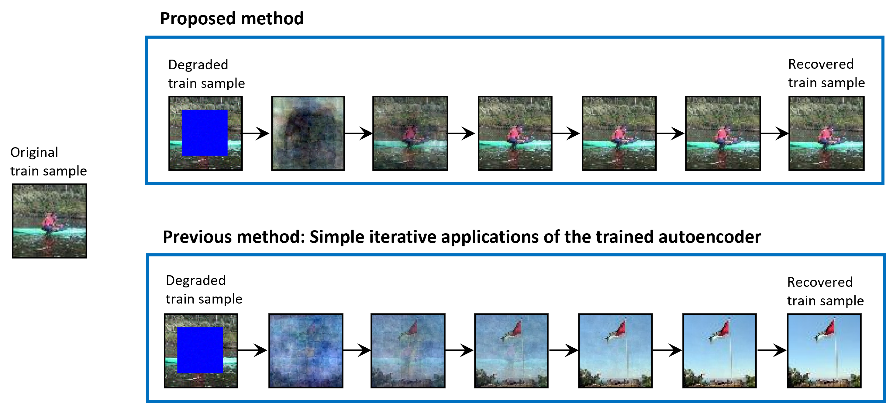 We study the recovery of training data from overparameterized autoencoder models. Given a degraded training sample, we define the recovery of the original sample as an inverse problem and formulate it as an optimization task. In our inverse problem, we use the trained autoencoder to implicitly define a regularizer for the particular training dataset that we aim to retrieve from. We develop the intricate optimization task into a practical method that iteratively applies the trained autoencoder and relatively simple computations that estimate and address the unknown degradation operator. We evaluate our method for blind inpainting where the goal is to recover training images from degradation of many missing pixels in an unknown pattern. We examine various deep autoencoder architectures, such as fully connected and U-Net (with various nonlinearities and at diverse train loss values), and show that our method significantly outperforms previous methods for training data recovery from autoencoders. Importantly, our method greatly improves the recovery performance also in settings that were previously considered highly challenging, and even impractical, for such retrieval.