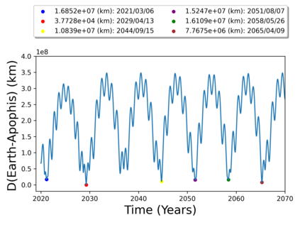 We aim at providing a preliminary approach on the dynamics of a spacecraft in orbit about the asteroid (99942) Apophis during its Earth close approach. The physical properties from the polyhedral shape of the target are derived assigning each tetrahedron to a point mass in its center. That considerably reduces the computation processing time compared to previous methods to evaluate the gravitational potential. The surfaces of section close to Apophis are build considering or not the gravitational perturbations of the Sun, the planets, and the SRP. The Earth is the one that most affects the invisticated region making the vast majority of the orbits to collide or escape from the system. Moreover, from numerical analysis of orbits started on March 1, 2029, the less perturbed region is characterized by the variation of the semimajor axis of 40-days orbits, which do not exceed 2 km very close to the central body ($a < 4$ km, $e < 0.4$). However, no regions investigated could be a possible option for inserting a spacecraft into natural orbits around Apophis during the close approach with our planet. Finally, to solve the stabilization problem in the system, we apply a robust path following control law to control the orbital geometry of a spacecraft. At last, we present an example of successful operation of our orbit control with a total $\bigtriangleup v$ of 0.495 m/s for 60 days. All our results are gathered in the CPM-ASTEROID database, which will be regularly updated by considering other asteroids.
