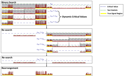 Research on the localization of the genetic basis associated with diseases or traits has been widely conducted in the last a few decades. Scan methods have been developed for region-based analysis in whole-genome association studies, helping us better understand how genetics influences human diseases or traits, especially when the aggregated effects of multiple causal variants are present. In this paper, we propose a fast and effective algorithm coupling with high-dimensional test for simultaneously detecting multiple signal regions, which is distinct from existing methods using scan or knockoff statistics. The idea is to conduct binary splitting with re-search and arrangement based on a sequence of dynamic critical values to increase detection accuracy and reduce computation. Theoretical and empirical studies demonstrate that our approach enjoys favorable theoretical guarantees with fewer restrictions and exhibits superior numerical performance with faster computation. Utilizing the UK Biobank data to identify the genetic regions related to breast cancer, we confirm previous findings and meanwhile, identify a number of new regions which suggest strong association with risk of breast cancer and deserve further investigation.