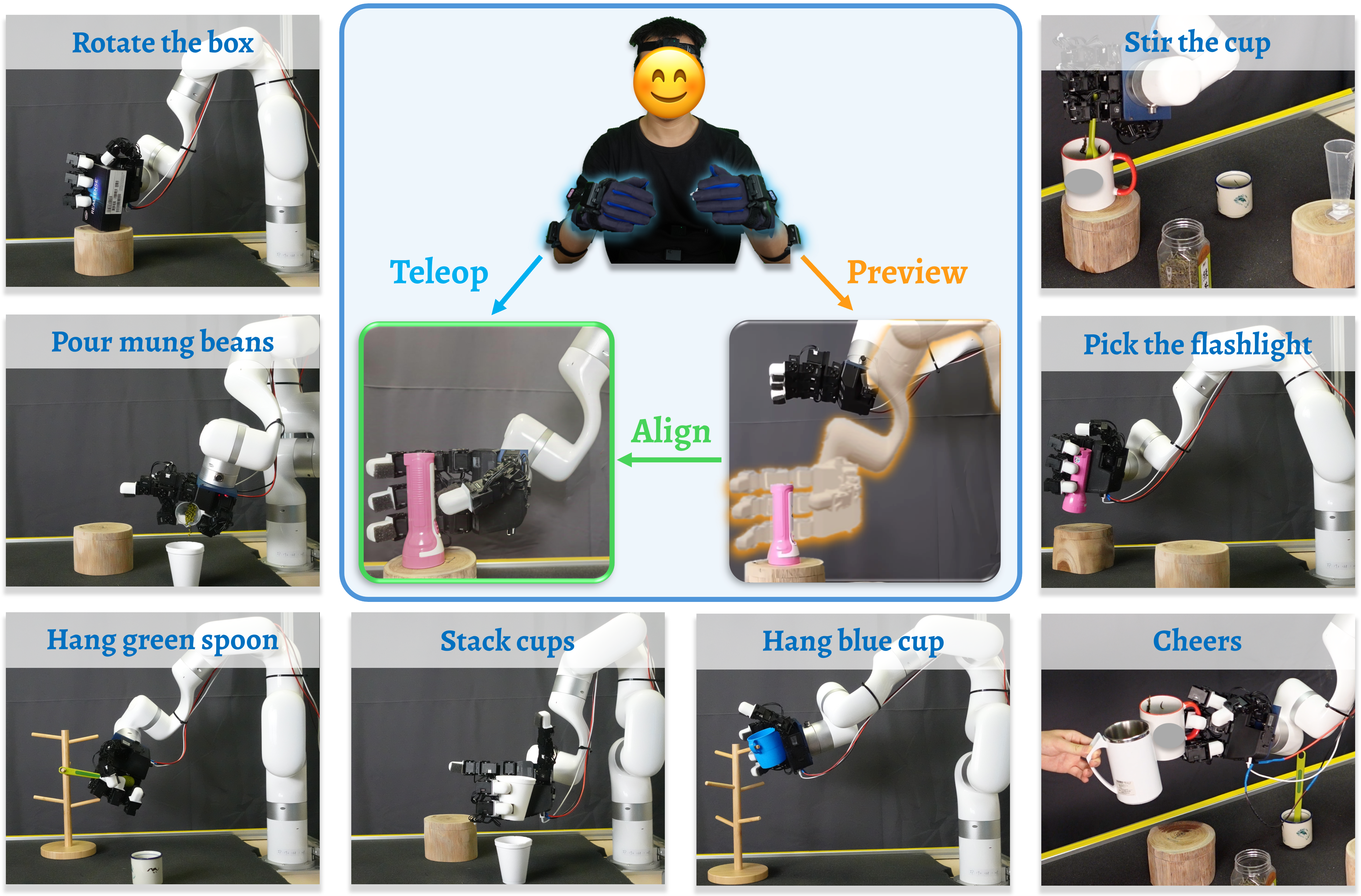 Teleoperation provides an effective way to collect robot data, which is crucial for learning from demonstrations. In this field, teleoperation faces several key challenges: user-friendliness for new users, safety assurance, and transferability across different platforms. While collecting real robot dexterous manipulation data by teleoperation to train robots has shown impressive results on diverse tasks, due to the morphological differences between human and robot hands, it is not only hard for new users to understand the action mapping but also raises potential safety concerns during operation. To address these limitations, we introduce TelePreview. This teleoperation system offers real-time visual feedback on robot actions based on human user inputs, with a total hardware cost of less than $1,000. TelePreview allows the user to see a virtual robot that represents the outcome of the user's next movement. By enabling flexible switching between command visualization and actual execution, this system helps new users learn how to demonstrate quickly and safely. We demonstrate that it outperforms other teleoperation systems across five tasks, emphasize its ease of use, and highlight its straightforward deployment across diverse robotic platforms. We release our code and a deployment document on our website https://nus-lins-lab.github.io/telepreview-web/.