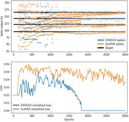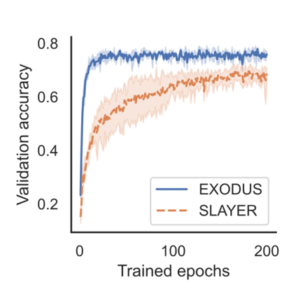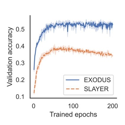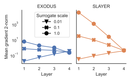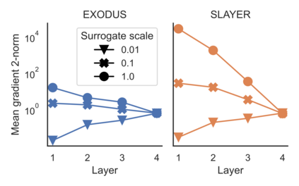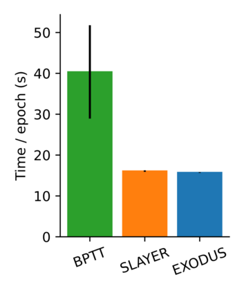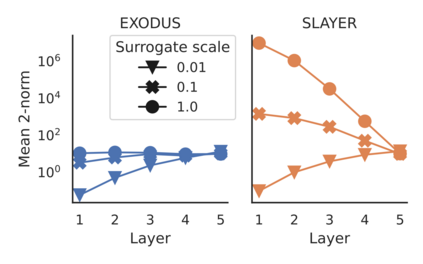 翻译:Spiking神经网络(SNNS)在能源效率极为重要的机器学习任务中正在获得显著的牵引力。然而,利用最先进的后反向分析时间(BBTT)对此类网络进行培训非常耗时。 Shrestha和Orchard [2018] 先前的工作使用了高效的GPU-加速后向分析算法,称为SLAYER,该算法大大加快了培训。 然而,SLAYER在计算梯度时没有考虑到神经重置机制,而我们认为这是数字不稳定的根源。为了抵消这一点,SLAYER在各层中引入了梯度超参数,这需要手工调整。在本文中,(i)我们修改SLAYER并设计了一个称为EXODUS的算法,该算出神经重置机制,并应用隐性函数理论来计算正确的梯度(相当于BPTT的算法),(ii)我们在计算梯度时没有考虑到神经重重重的重置机制,因此,我们不需要在梯度上进行梯度的缩缩缩缩,因此需要跨度,在各层次上设置上,从而降低SRAY(SUR三)在模拟中可以进行精确的计算。