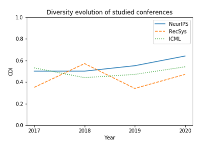 翻译:目前人们关注的是,人工智能(AI)领域缺乏多样性,一些倡议,例如筹资计划和指导方案,已经设计来克服这一问题,然而,没有说明这些倡议如何在短期和长期内实际影响AI多样性。这项工作研究在这一特定背景下的多样性概念,并提出了AI科学活动的一小部分多样性指标(即指数)。这些指标旨在量化AI领域的多样性,并监测其演变情况。我们从性别、地理位置和商业方面考虑多样性(被理解为学术界与工业界的存在)。我们为会议的不同社区,即作者、主旨发言人和组织委员会计算了这些指标。我们从这些组成部分中计算了每次AI活动的概括多样性指标。我们评估了一套最近大赦国际大型会议的拟议指数,并讨论了这些会议的价值和局限性。