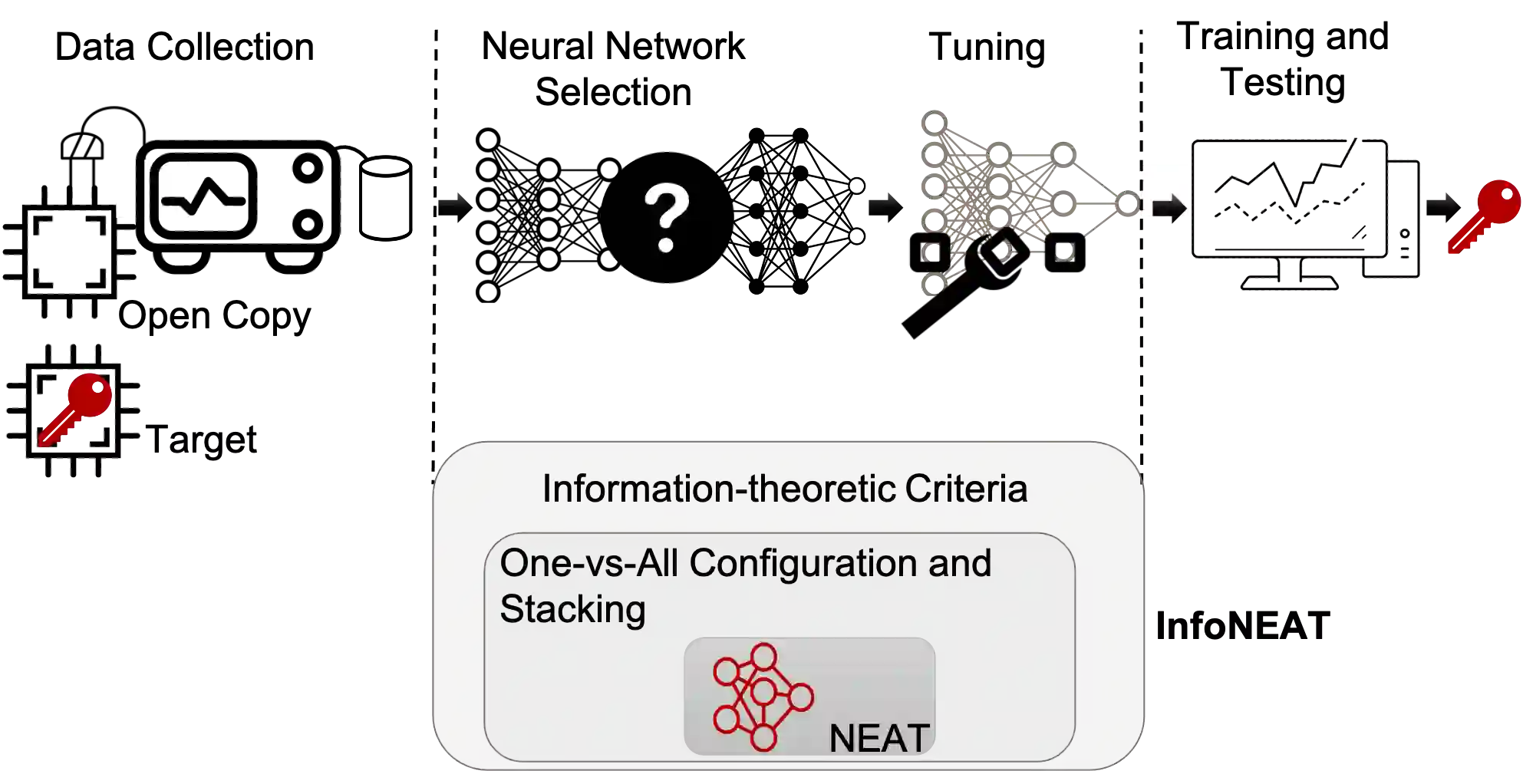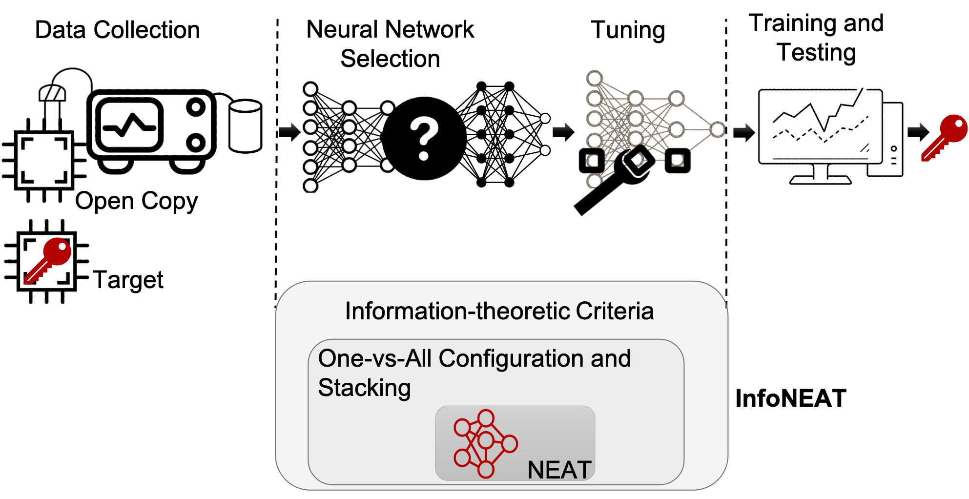 Profiled side-channel analysis (SCA) leverages leakage from cryptographic implementations to extract the secret key. When combined with advanced methods in neural networks (NNs), profiled SCA can successfully attack even those cryptocores assumed to be protected against SCA. Despite the rise in the number of studies devoted to NN-based SCA, a range of questions has remained unanswered, namely: how to choose a NN with an adequate configuration, how to tune the NN's hyperparameters, when to stop the training, etc. Our proposed approach, "InfoNEAT," tackles these issues in a natural way. InfoNEAT relies on the concept of neural structure search, enhanced by information-theoretic metrics to guide the evolution, halt it with a novel stopping criteria, and improve time-complexity and memory footprint. The performance of InfoNEAT is evaluated by applying it to publicly available datasets composed of real side-channel measurements. In addition to the considerable advantages regarding the automated configuration of NNs, InfoNEAT demonstrates significant improvements over other approaches for effective key recovery in terms of the number of epochs (e.g.,x6 faster) and the number of attack traces compared to both MLPs and CNNs (e.g., up to 1000s fewer traces to break a device) as well as a reduction in the number of trainable parameters compared to MLPs (e.g., by the factor of up to 32). Furthermore, through experiments, it is demonstrated that InfoNEAT's models are robust against the noise and desynchronization in traces.
