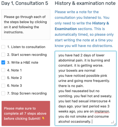 Automatic summarisation has the potential to aid physicians in streamlining clerical tasks such as note taking. But it is notoriously difficult to evaluate these systems and demonstrate that they are safe to be used in a clinical setting. To circumvent this issue, we propose a semi-automatic approach whereby physicians post-edit generated notes before submitting them. We conduct a preliminary study on the time saving of automatically generated consultation notes with post-editing. Our evaluators are asked to listen to mock consultations and to post-edit three generated notes. We time this and find that it is faster than writing the note from scratch. We present insights and lessons learnt from this experiment.