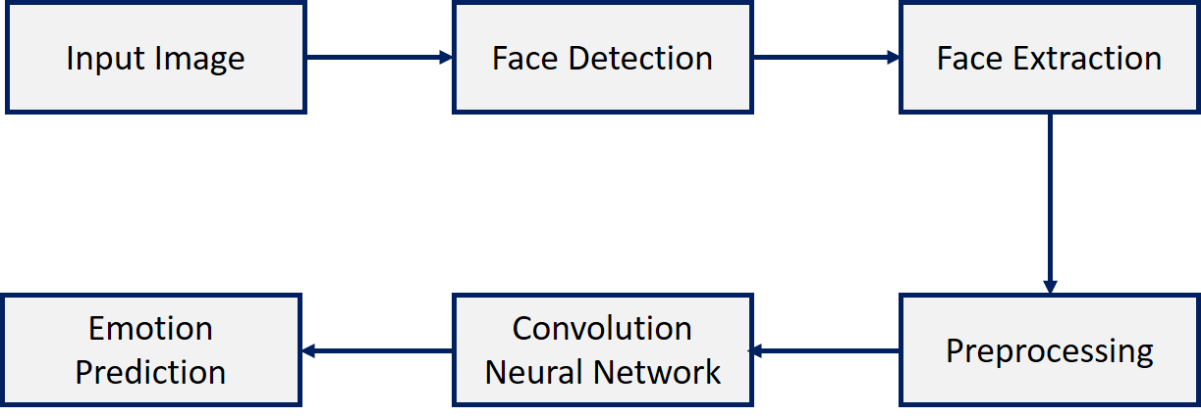 Facial expressions vary from person to person, and the brightness, contrast, and resolution of every random image are different. This is why recognizing facial expressions is very difficult. This article proposes an efficient system for facial emotion recognition for the seven basic human emotions (angry, disgust, fear, happy, sad, surprise, and neutral), using a convolution neural network (CNN), which predicts and assigns probabilities to each emotion. Since deep learning models learn from data, thus, our proposed system processes each image with various pre-processing steps for better prediction. Every image was first passed through the face detection algorithm to include in the training dataset. As CNN requires a large amount of data, we duplicated our data using various filters on each image. Pre-processed images of size 80*100 are passed as input to the first layer of CNN. Three convolutional layers were used, followed by a pooling layer and three dense layers. The dropout rate for the dense layer was 20%. The model was trained by combining two publicly available datasets, JAFFE and KDEF. 90% of the data was used for training, while 10% was used for testing. We achieved maximum accuracy of 78.1 % using the combined dataset. Moreover, we designed an application of the proposed system with a graphical user interface that classifies emotions in real-time.