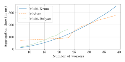 翻译:分布式机器学习的梯度汇总规则( GAR) 能否既有力又快速? 本文通过多布林语的肯定回答是肯定的。 鉴于美元工人,其中美元是任意恶意( Byzantine) 和 美元=n- f$不是,我们证明多布林可以确保强大的Byzantine抗御能力形式,以及美元(frac{m ⁇ n ⁇ $)的减速,与平均相比,这是分布式机器学习最快(但非Byzantine有弹性)的规则。当美元(几乎所有工人都是正确的)时,多布林语达到平均速度。 我们还证明,多布林语在当地计算中的成本是$(d) (类似于平均) 美元,这是多布林语中的一个重要特征,因为美元通常达到 10 ⁇ 9美元,而稳健的替代品至少以美元计算成四分价成本。 我们的理论结论得到了实验性评估的补充,除了支持线性美元(d) 复杂性论证外,还表明多布林的平行性能进一步增加其平行性。