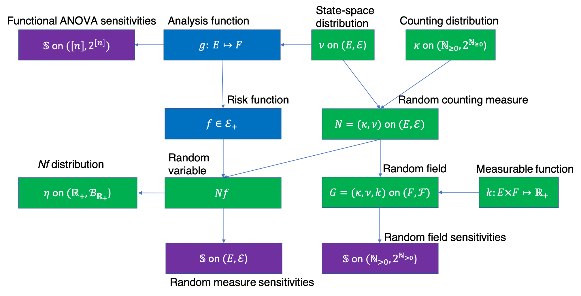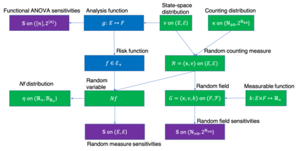 We present a general framework for uncertainty quantification that is a mosaic of interconnected models. We define global first and second order structural and correlative sensitivity analyses for random counting measures acting on risk functionals of input-output maps. These are the ANOVA decomposition of the intensity measure and the decomposition of the random measure variance, each into subspaces. Orthogonal random measures furnish sensitivity distributions. We show that the random counting measure may be used to construct positive random fields, which admit decompositions of covariance and sensitivity indices and may be used to represent interacting particle systems. The first and second order global sensitivity analyses conveyed through random counting measures elucidate and integrate different notions of uncertainty quantification, and the global sensitivity analysis of random fields conveys the proportionate functional contributions to covariance. This framework complements others when used in conjunction with for instance algorithmic uncertainty and model selection uncertainty frameworks.