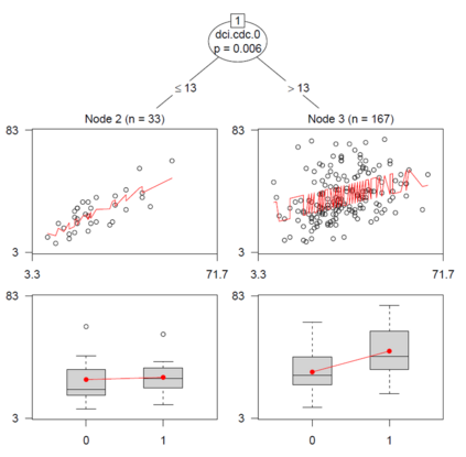 翻译:在这项研究中,我们开发并内部验证了一个可变决定树模型,预测基于互联网的治疗对基于互联网的症状的多维综合分数的影响。然而,对于所有最先进的治疗,仍然普遍地存在不反应的现象,而且不清楚预计哪些患者群体将从基于互联网的干预中受益最大。多变量预测模型越来越多地用于确定不同治疗效果的预测值,并分配出最大预期效益的治疗。在这个研究中,我们开发并内部验证了一个可变决定树模型,预测基于互联网的治疗对基于互联网的GPPPD症状的多维综合分数分数的影响。但是,将基于互联网的干预与基于互联网的控制组(N=200)进行随机对照试验的数据,用于使用基于模型的循环隔断层模型开发一个决定树模型。模型的性能通过对表面和靴带偏差模型的纠正性能进行评估。最后的确定树包括一个分解变量,即联合对基于两个响应组的硬度值为美元。(在两个响应组上发现,直径值为95-R=0.33;对低的病人的直径直径直径直径值为95=0.48=0.33。</s>