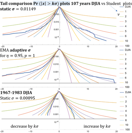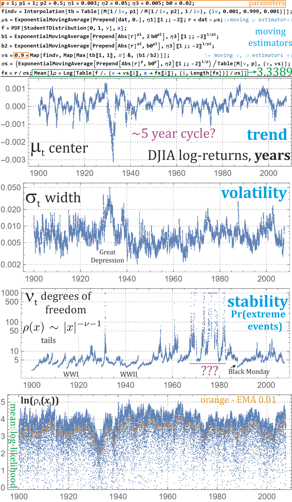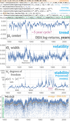 The real life time series are usually nonstationary, bringing a difficult question of model adaptation. Classical approaches like ARMA-ARCH assume arbitrary type of dependence. To avoid their bias, we will focus on recently proposed agnostic philosophy of moving estimator: in time $t$ finding parameters optimizing e.g. $F_t=\sum_{\tau<t} (1-\eta)^{t-\tau} \ln(\rho_\theta (x_\tau))$ moving log-likelihood, evolving in time. It allows for example to estimate parameters using inexpensive exponential moving averages (EMA), like absolute central moments $m_p=E[|x-\mu|^p]$ evolving for one or multiple powers $p\in\mathbb{R}^+$ using $m_{p,t+1} = m_{p,t} + \eta (|x_t-\mu_t|^p-m_{p,t})$. Application of such general adaptive methods of moments will be presented on Student's t-distribution, popular especially in economical applications, here applied to log-returns of DJIA companies. While standard ARMA-ARCH approaches provide evolution of $\mu$ and $\sigma$, here we also get evolution of $\nu$ describing $\rho(x)\sim |x|^{-\nu-1}$ tail shape, probability of extreme events - which might turn out catastrophic, destabilizing the market.