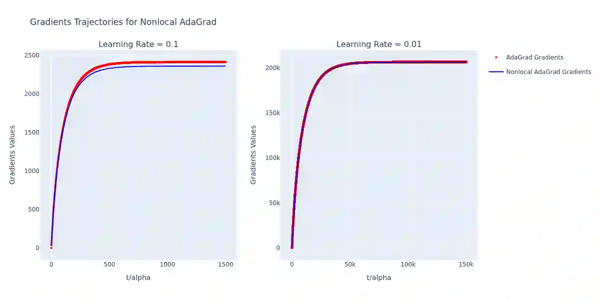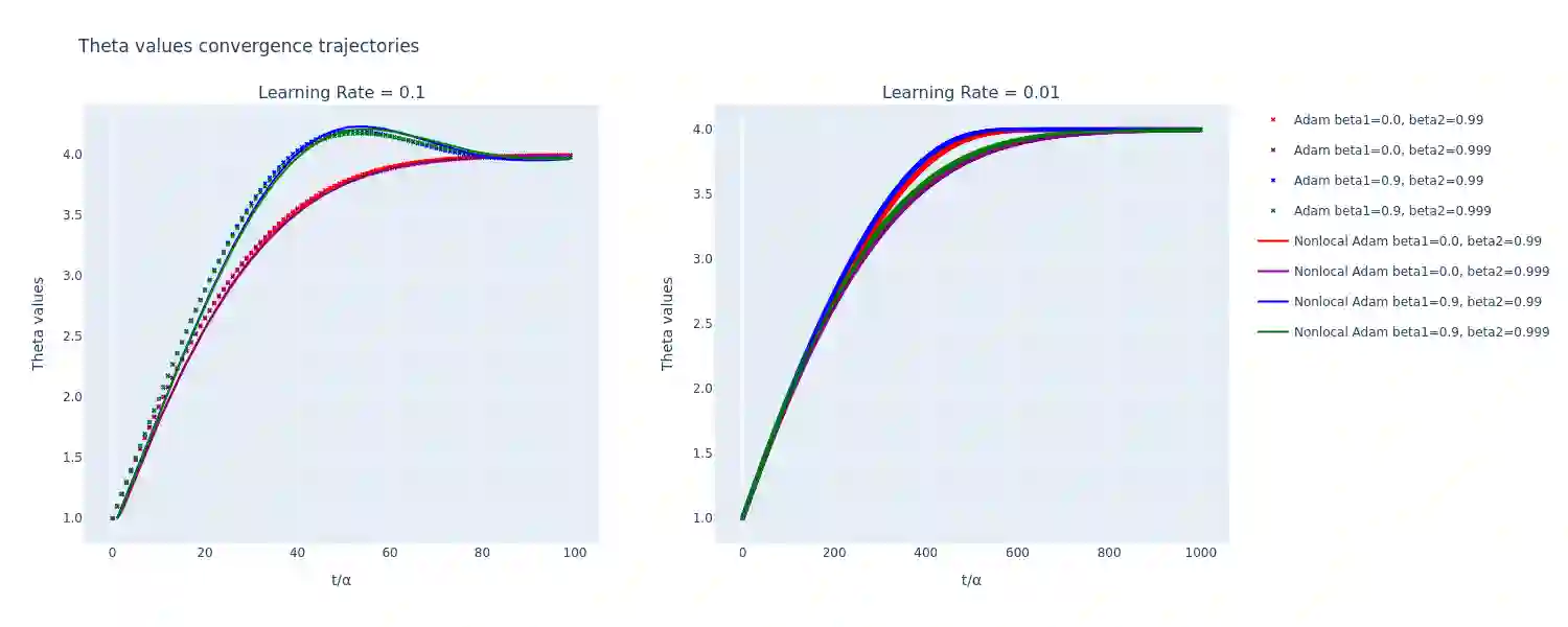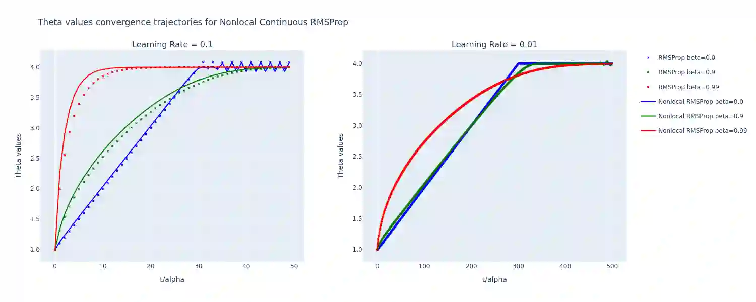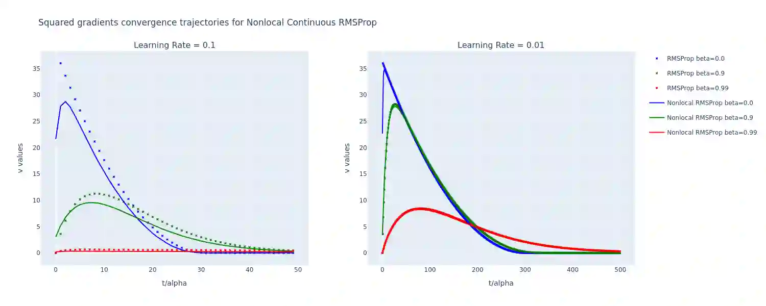 In this paper, we propose a continuous-time formulation for the AdaGrad, RMSProp, and Adam optimization algorithms by modeling them as first-order integro-differential equations. We perform numerical simulations of these equations, along with stability and convergence analyses, to demonstrate their validity as accurate approximations of the original algorithms. Our results indicate a strong agreement between the behavior of the continuous-time models and the discrete implementations, thus providing a new perspective on the theoretical understanding of adaptive optimization methods.