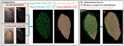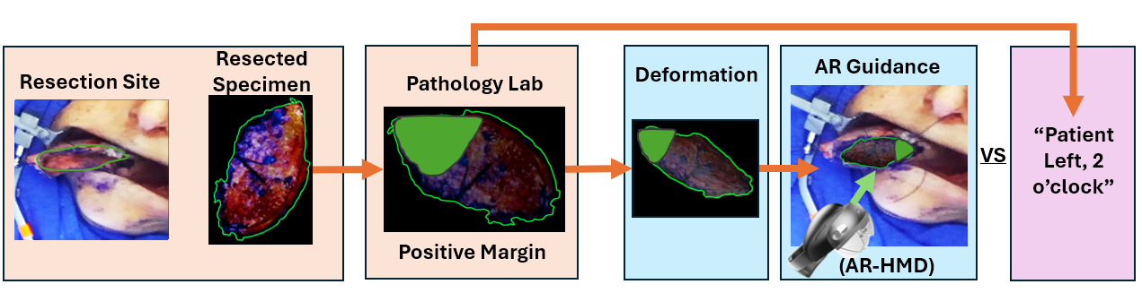 Head and neck squamous cell carcinoma (HNSCC) has one of the highest rates of recurrence cases among solid malignancies. Recurrence rates can be reduced by improving positive margins localization. Frozen section analysis (FSA) of resected specimens is the gold standard for intraoperative margin assessment. However, because of the complex 3D anatomy and the significant shrinkage of resected specimens, accurate margin relocation from specimen back onto the resection site based on FSA results remains challenging. We propose a novel deformable registration framework that uses both the pre-resection upper surface and the post-resection site of the specimen to incorporate thickness information into the registration process. The proposed method significantly improves target registration error (TRE), demonstrating enhanced adaptability to thicker specimens. In tongue specimens, the proposed framework improved TRE by up to 33% as compared to prior deformable registration. Notably, tongue specimens exhibit complex 3D anatomies and hold the highest clinical significance compared to other head and neck specimens from the buccal and skin. We analyzed distinct deformation behaviors in different specimens, highlighting the need for tailored deformation strategies. To further aid intraoperative visualization, we also integrated this framework with an augmented reality-based auto-alignment system. The combined system can accurately and automatically overlay the deformed 3D specimen mesh with positive margin annotation onto the resection site. With a pilot study of the AR guided framework involving two surgeons, the integrated system improved the surgeons' average target relocation error from 9.8 cm to 4.8 cm.
