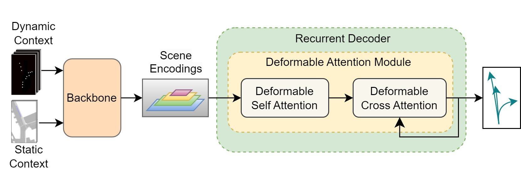 Motion prediction is an important aspect for Autonomous Driving (AD) and Advance Driver Assistance Systems (ADAS). Current state-of-the-art motion prediction methods rely on High Definition (HD) maps for capturing the surrounding context of the ego vehicle. Such systems lack scalability in real-world deployment as HD maps are expensive to produce and update in real-time. To overcome this issue, we propose Context Aware Scene Prediction Transformer (CASPFormer), which can perform multi-modal motion prediction from rasterized Bird-Eye-View (BEV) images. Our system can be integrated with any upstream perception module that is capable of generating BEV images. Moreover, CASPFormer directly decodes vectorized trajectories without any postprocessing. Trajectories are decoded recurrently using deformable attention, as it is computationally efficient and provides the network with the ability to focus its attention on the important spatial locations of the BEV images. In addition, we also address the issue of mode collapse for generating multiple scene-consistent trajectories by incorporating learnable mode queries. We evaluate our model on the nuScenes dataset and show that it reaches state-of-the-art across multiple metrics