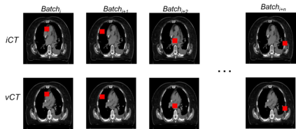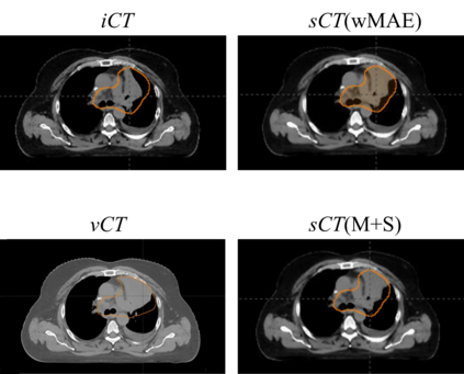 方法:开发了一个基于视觉变换块的非对称自动编码器网络。数据来自1个头颈部患者:2个正交的kV图像(1024x1024体素)、1个带填充的3D CT(512x512x512),在取得kV图像之前从射线CT-On-Rails中获取,以及基于CT的2个数字重建放射学图像(DRR)(512x512)。我们每隔8个体素对kV图像进行采样,每隔4个体素对DRR和CT进行采样,从而形成了一个由262144个样本组成的数据集,其中每个方向的图像的尺寸为128。在训练中,同时利用了kV和DRR图像,并鼓励编码器从两种图像中学习联合特征图。在测试中,仅使用独立的kV图像。通过按照它们的空间信息连接模型生成的sCT的sCT连接,实现了全尺寸的合成CT(sCT)。使用平均绝对误差(MAE)和每体素绝对CT数字差异体积直方图(CDVH)评估了合成CT(sCT)的图像质量。