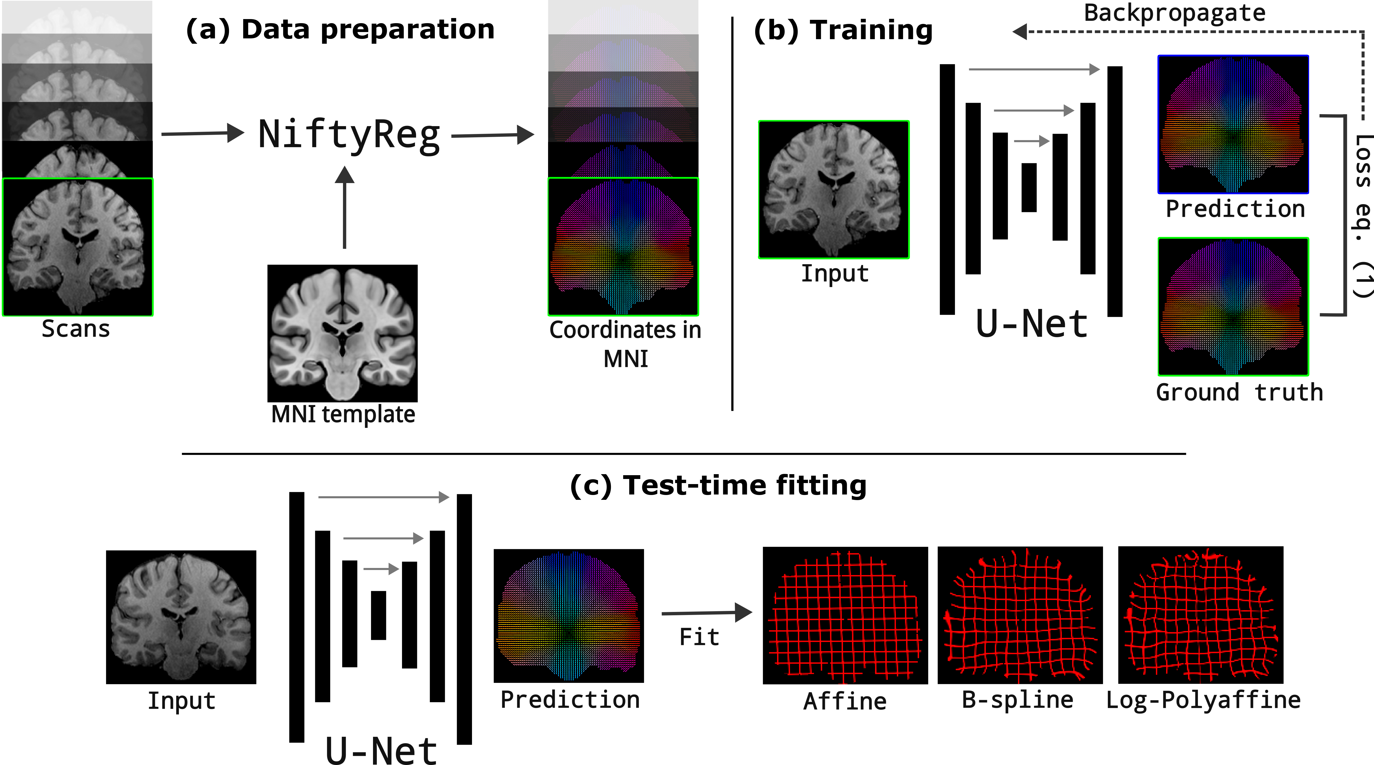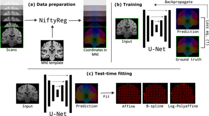 In human neuroimaging studies, atlas registration enables mapping MRI scans to a common coordinate frame, which is necessary to aggregate data from multiple subjects. Machine learning registration methods have achieved excellent speed and accuracy but lack interpretability. More recently, keypoint-based methods have been proposed to tackle this issue, but their accuracy is still subpar, particularly when fitting nonlinear transforms. Here we propose Registration by Regression (RbR), a novel atlas registration framework that is highly robust and flexible, conceptually simple, and can be trained with cheaply obtained data. RbR predicts the (x,y,z) atlas coordinates for every voxel of the input scan (i.e., every voxel is a keypoint), and then uses closed-form expressions to quickly fit transforms using a wide array of possible deformation models, including affine and nonlinear (e.g., Bspline, Demons, invertible diffeomorphic models, etc.). Robustness is provided by the large number of voxels informing the registration and can be further increased by robust estimators like RANSAC. Experiments on independent public datasets show that RbR yields more accurate registration than competing keypoint approaches, while providing full control of the deformation model.