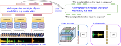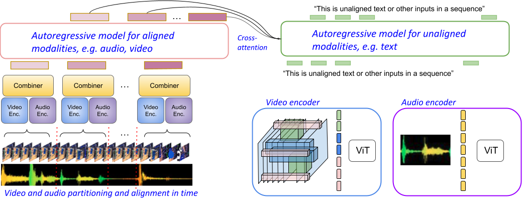 One of the main challenges of multimodal learning is the need to combine heterogeneous modalities (e.g., video, audio, text). For example, video and audio are obtained at much higher rates than text and are roughly aligned in time. They are often not synchronized with text, which comes as a global context, e.g., a title, or a description. Furthermore, video and audio inputs are of much larger volumes, and grow as the video length increases, which naturally requires more compute dedicated to these modalities and makes modeling of long-range dependencies harder. We here decouple the multimodal modeling, dividing it into separate, focused autoregressive models, processing the inputs according to the characteristics of the modalities. We propose a multimodal model, called Mirasol3B, consisting of an autoregressive component for the time-synchronized modalities (audio and video), and an autoregressive component for the context modalities which are not necessarily aligned in time but are still sequential. To address the long-sequences of the video-audio inputs, we propose to further partition the video and audio sequences in consecutive snippets and autoregressively process their representations. To that end, we propose a Combiner mechanism, which models the audio-video information jointly within a timeframe. The Combiner learns to extract audio and video features from raw spatio-temporal signals, and then learns to fuse these features producing compact but expressive representations per snippet. Our approach achieves the state-of-the-art on well established multimodal benchmarks, outperforming much larger models. It effectively addresses the high computational demand of media inputs by both learning compact representations, controlling the sequence length of the audio-video feature representations, and modeling their dependencies in time.