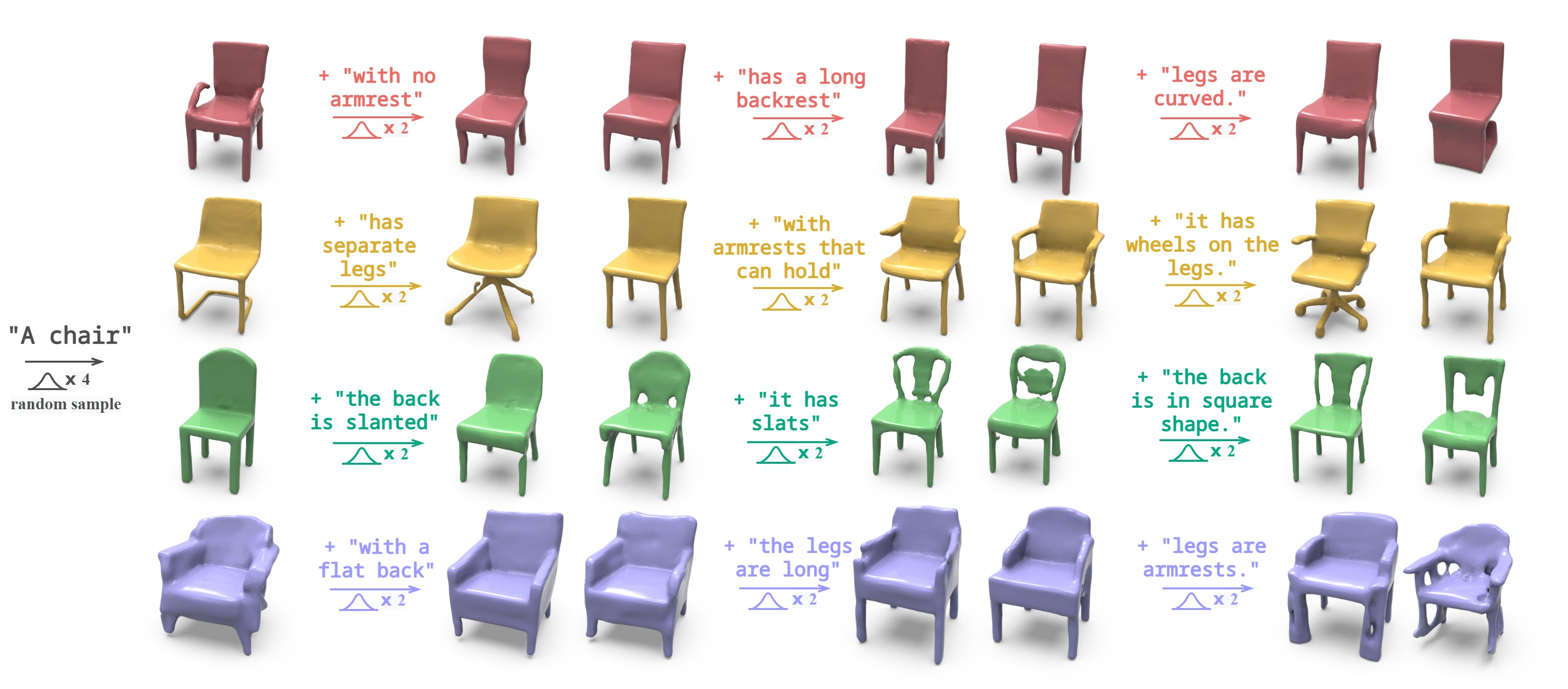 翻译:我们为循环文本附加 3D 形状生成提供了一个神经网络 。 生成文本附加 3D 形状的现有方法消耗了整个文本, 在一个步骤中生成一个 3D 形状。 然而, 人类倾向于以初始描述开始描述形状, 并逐步根据中间结果添加细节 。 为了捕捉此循环过程, 我们引入了一个生成 3D 形状分布的方法, 以初始短语为条件, 随着更多短语的添加而逐渐演变 。 由于现有的数据集不足以培训这个方法, 我们呈现了 Text2Shape++, 是一个支持递归形状生成的369K 形状组合的庞大数据集 。 为了捕捉取通常用于完善形状描述的本地细节, 我们以矢量的深度隐含功能为顶层, 产生高质量形状的分布 。 结果显示, 我们的方法可以生成与文本描述相一致的形状, 并且随着更多短语的添加而逐渐演变 。 我们的方法支持形状编辑、 外推, 并且能够为创造性设计提供新的人类机器合作应用 。