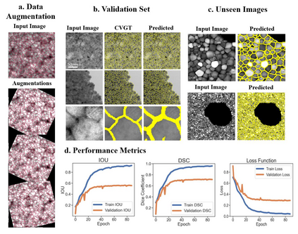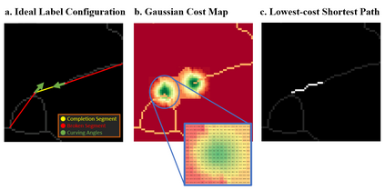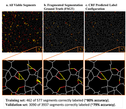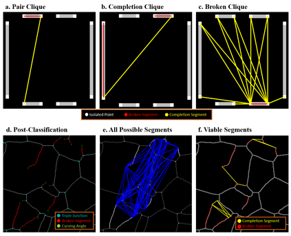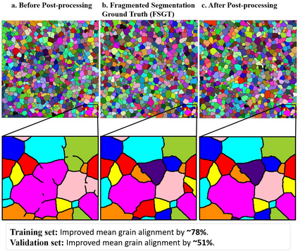 Accurate segmentation of interconnected line networks, such as grain boundaries in polycrystalline material microstructures, poses a significant challenge due to the fragmented masks produced by conventional computer vision algorithms, including convolutional neural networks. These algorithms struggle with thin masks, often necessitating intricate post-processing for effective contour closure and continuity. Addressing this issue, this paper introduces a fast, high-fidelity post-processing technique, leveraging domain knowledge about grain boundary connectivity and employing conditional random fields and perceptual grouping rules. This approach significantly enhances segmentation mask accuracy, achieving a 79% segment identification accuracy in validation with a U-Net model on electron microscopy images of a polycrystalline oxide. Additionally, a novel grain alignment metric is introduced, showing a 51% improvement in grain alignment, providing a more detailed assessment of segmentation performance for complex microstructures. This method not only enables rapid and accurate segmentation but also facilitates an unprecedented level of data analysis, significantly improving the statistical representation of grain boundary networks, making it suitable for a range of disciplines where precise segmentation of interconnected line networks is essential.