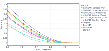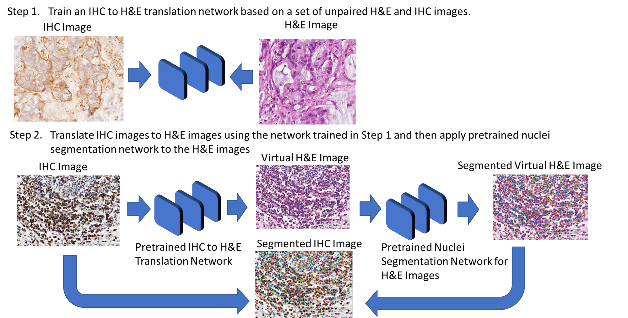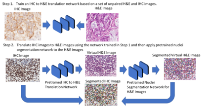 翻译:已经为H&E图像的核分离开发了许多基于深层次学习的方法,这些方法已经接近人类的性能,然而,将这类方法直接应用到另一种图像模式,如Immunohistechicistry(IHC)图像,可能无法取得令人满意的性能。因此,我们开发了一种基于基因的反向网络(GAN)方法,将IHC图像转化为H&E图像,同时保留核心位置和形态学,然后对虚拟H&E图像应用预先训练的核分离模型。 我们证明,拟议方法比几种基线方法效果更好,包括直接应用诸如Cellpose和HVer-Net(Cellpose)等艺术核分离法状态和GeepLIIF(TeepLIF,使用两个公开的IHC图像数据集)。