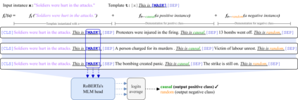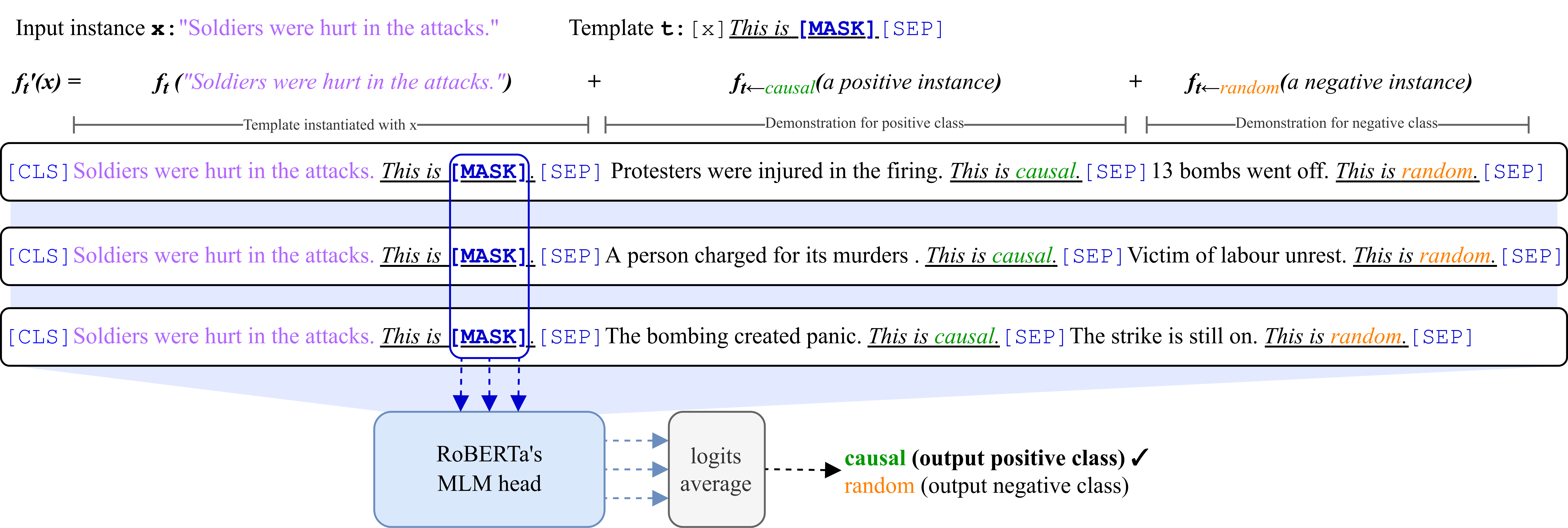 In this paper, we describe our participation in the subtask 1 of CASE-2022, Event Causality Identification with Casual News Corpus. We address the Causal Relation Identification (CRI) task by exploiting a set of simple yet complementary techniques for fine-tuning language models (LMs) on a small number of annotated examples (i.e., a few-shot configuration). We follow a prompt-based prediction approach for fine-tuning LMs in which the CRI task is treated as a masked language modeling problem (MLM). This approach allows LMs natively pre-trained on MLM problems to directly generate textual responses to CRI-specific prompts. We compare the performance of this method against ensemble techniques trained on the entire dataset. Our best-performing submission was trained only with 256 instances per class, a small portion of the entire dataset, and yet was able to obtain the second-best precision (0.82), third-best accuracy (0.82), and an F1-score (0.85) very close to what was reported by the winner team (0.86).