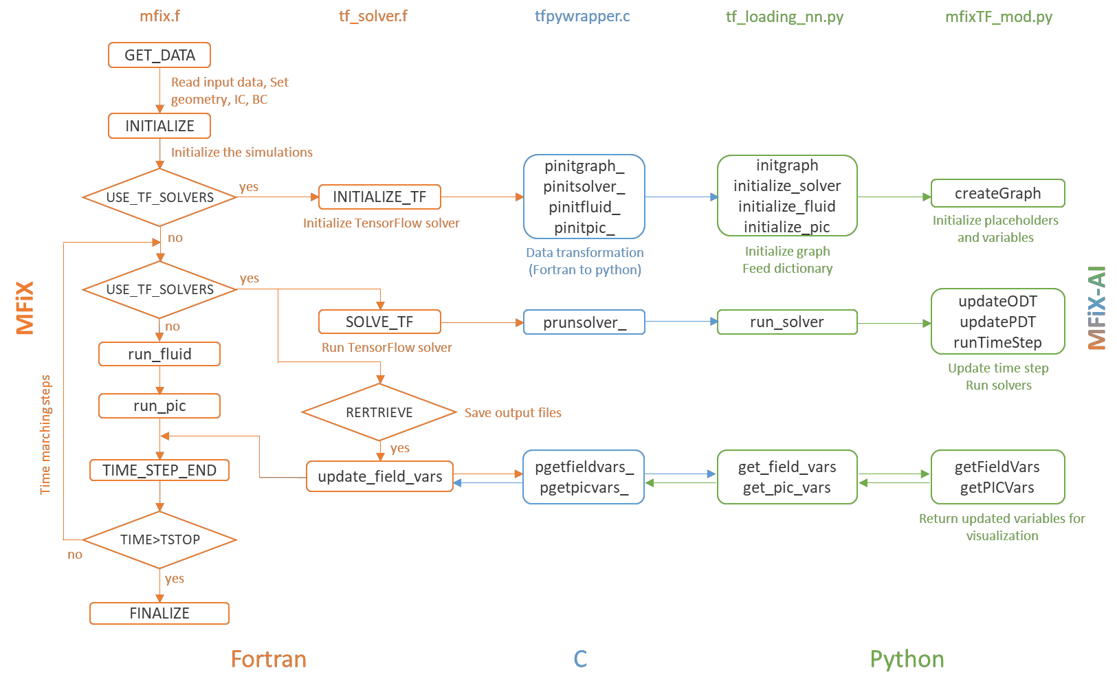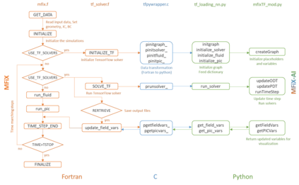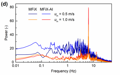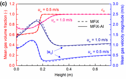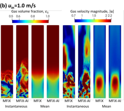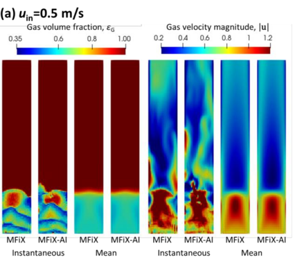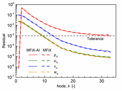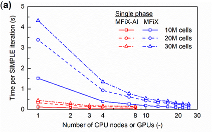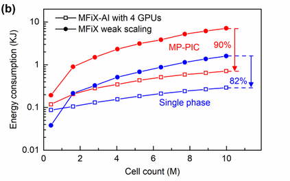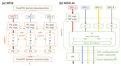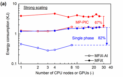 Manufacturers have been developing new graphics processing unit (GPU) nodes with large capacity, high bandwidth memory and very high bandwidth intra-node interconnects. This enables moving large amounts of data between GPUs on the same node at low cost. However, small packet bandwidths and latencies have not decreased which makes global dot products expensive. These characteristics favor a new kind of problem decomposition called "equation decomposition" rather than traditional domain decomposition. In this approach, each GPU is assigned one equation set to solve in parallel so that the frequent and expensive dot product synchronization points in traditional distributed linear solvers are eliminated. In exchange, the method involves infrequent movement of state variables over the high bandwidth, intra-node interconnects. To test this theory, our flagship code Multiphase Flow with Interphase eXchanges (MFiX) was ported to TensorFlow. This new product is known as MFiX-AI and can produce near identical results to the original version of MFiX with significant acceleration in multiphase particle-in-cell (MP-PIC) simulations. The performance of a single node with 4 NVIDIA A100s connected over NVLINK 2.0 was shown to be competitive to 1000 CPU cores (25 nodes) on the JOULE 2.0 supercomputer, leading to an energy savings of up to 90%. This is a substantial performance benefit for small- to intermediate-sized problems. This benefit is expected to grow as GPU nodes become more powerful. Further, MFiX-AI is poised to accept native artificial intelligence/machine learning models for further acceleration and development.