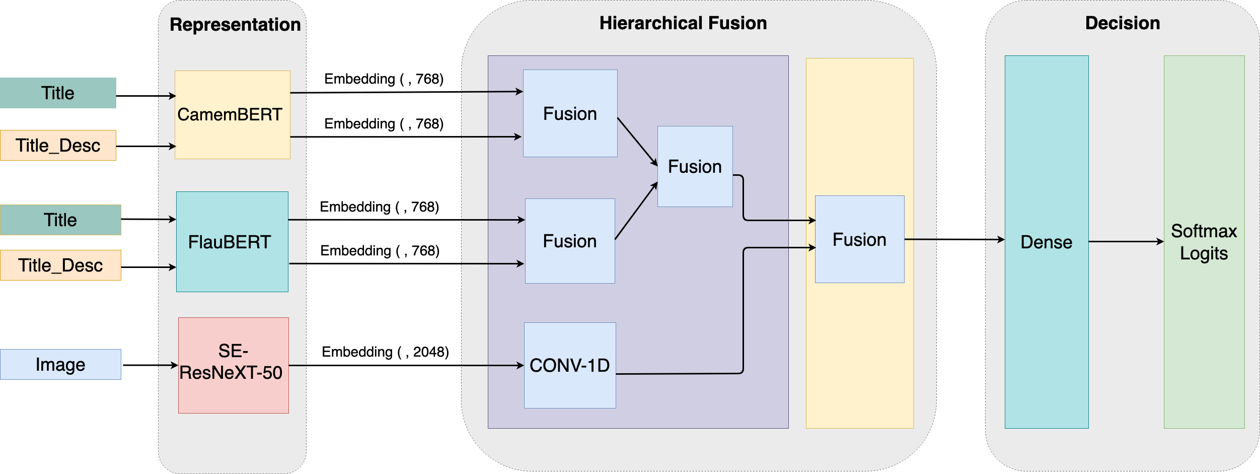 翻译:在这项工作中,我们提出了一个商业产品分类的多模式模型,其中结合了由多种神经网络模型从文本(CammBERT和FlauBERT)和视觉数据(SE-ResNeXt-50)中利用简单的聚合技术提取的特征,拟议的方法大大优于单式模型的性能和所报告的关于我们具体任务的类似模型的性能。我们用多种引信技术进行了实验,发现将单式网络的单个嵌入结合起来的最佳技术是以合并和平均地貌矢量为基础的。每一种模式都补充了其他模式的缺点,表明增加模式的数量可以成为改进多标签和多式分类问题绩效的有效方法。