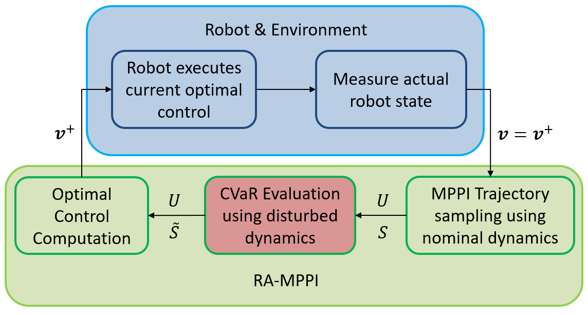 翻译:在本文中,我们为受任意形式不确定性影响的自主机器人展示了一种新型模型预测控制方法。 拟议的风险- 软件模型预测路径综合控制( RA- MPPI) 使用条件值在危险环境中生成最佳控制动作的措施, 以产生对安全至关重要的机器人应用程序的最佳控制行动。 不同于大多数现有的Stochastic MPC 和 CVaR优化方法, 后者将原始动态线性线性化, 并将控制任务编成锥形程序, 拟议的方法直接使用原始动态, 而不限制成本函数或噪音的形式。 我们将新型的RA- MPPI 控制器应用到一个自主的飞行器, 在布满的环境中执行积极的驾驶动作。 我们的模拟和实验显示, 拟议的RA- MPPI 控制器可以在与基线 MPPI 控制器相较相较相近的相近的相同时间内完成相同的时间。 提议的控制器在80Hz 的更新频率上进行在线计算, 使用现代图形处理器( GPUPUs) 来多读轨迹谱和 CVR 值。