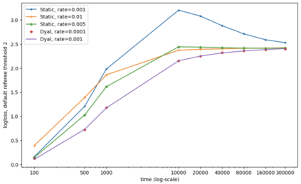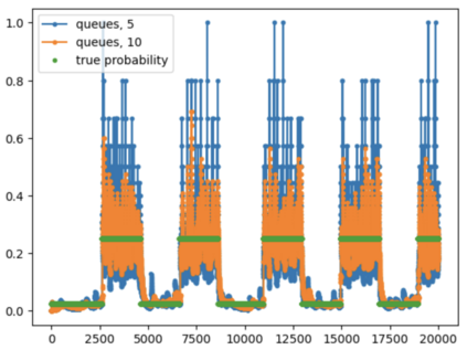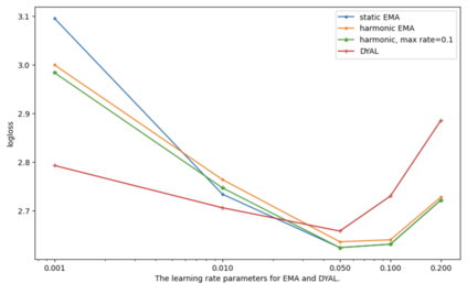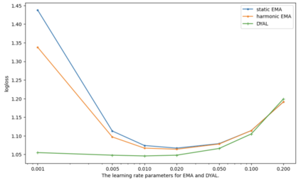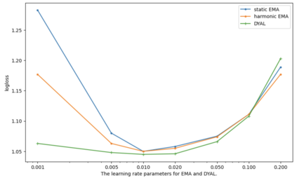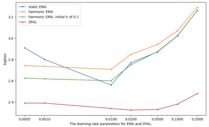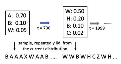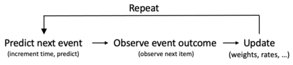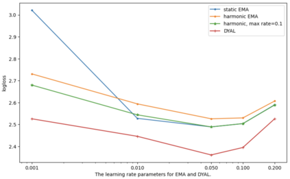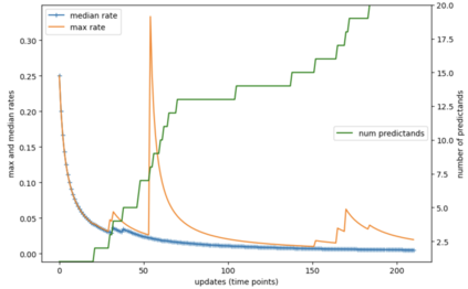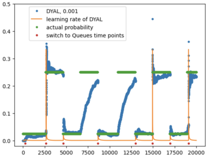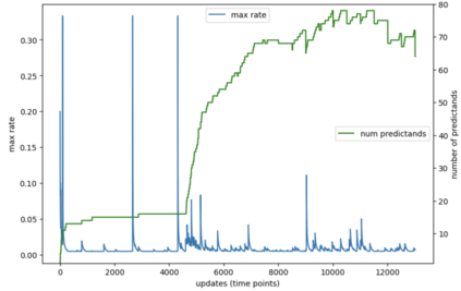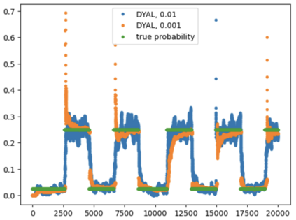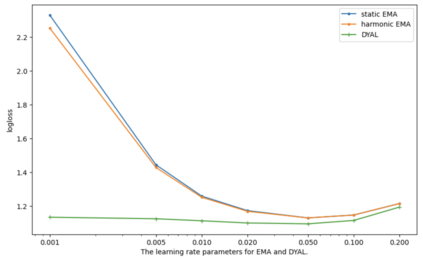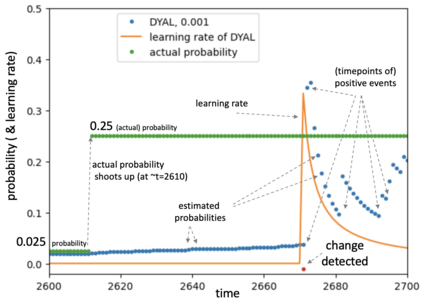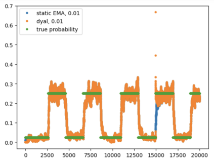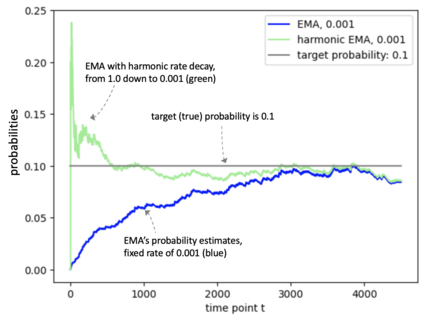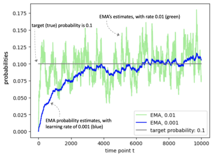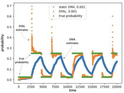 Consider a predictor, a learner, whose input is a stream of discrete items. The predictor's task, at every time point, is probabilistic multiclass prediction, i.e., to predict which item may occur next by outputting zero or more candidate items, each with a probability, after which the actual item is revealed and the predictor learns from this observation. To output probabilities, the predictor keeps track of the proportions of the items it has seen. The predictor has constant (limited) space and we seek efficient prediction and update techniques: The stream is unbounded, the set of items is unknown to the predictor and their totality can also grow unbounded. Moreover, there is non-stationarity: the underlying frequencies of items may change, substantially, from time to time. For instance, new items may start appearing and a few currently frequent items may cease to occur again. The predictor, being space-bounded, need only provide probabilities for those items with (currently) sufficiently high frequency, i.e., the salient items. This problem is motivated in the setting of prediction games, a self-supervised learning regime where concepts serve as both the predictors and the predictands, and the set of concepts grows over time, resulting in non-stationarities as new concepts are generated and used. We develop moving average techniques designed to respond to such non-stationarities in a timely manner, and explore their properties. One is a simple technique based on queuing of count snapshots, and another is a combination of queuing together with an extended version of sparse EMA. The latter combination supports predictand-specific dynamic learning rates. We find that this flexibility allows for a more accurate and timely convergence.