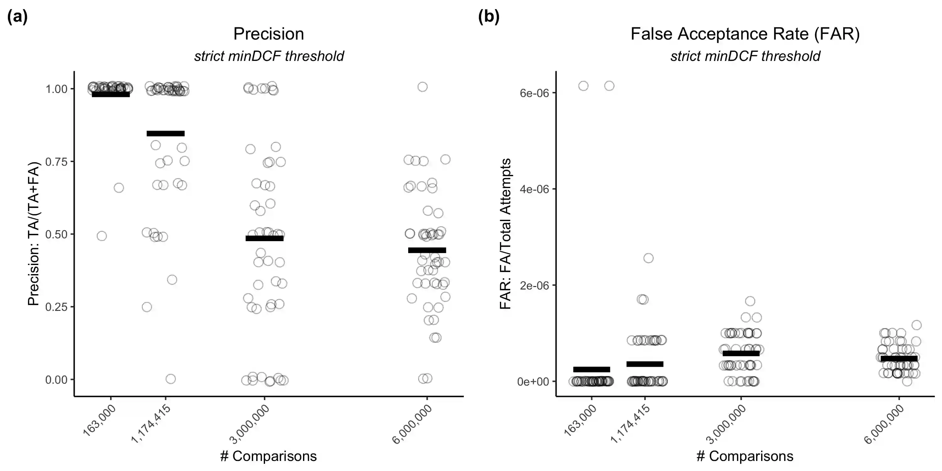 翻译:为了利用基于语言的保健工具,需要大量整理数据集,以利用基于语言的保健工具。制作这些数据集费用昂贵,导致对数据共享的兴趣增加。由于演讲可能识别发言者(即语音指纹),共享录音会引起隐私问题。我们使用最先进的语音识别系统,在不参考人口或元数据的情况下,审查语音录音的重新识别风险。我们证明,风险与对手必须考虑的比较数量(即搜索空间)存在反向关系。小搜索空间的风险很高,但随着搜索空间的增长而下降(精确度 > 0.85美元,为 < 1*10 ⁇ 6美元),进行比较,为0.5美元,为 > 310 ⁇ 6美元) 。接下来,我们显示,语音记录的性质影响重新识别风险,而无关联的语音(如誓言延长)则更难识别。我们的研究结果表明,语音识别系统可用于在特定情况下重新识别参与者,但在实践中,重新识别风险似乎较低。