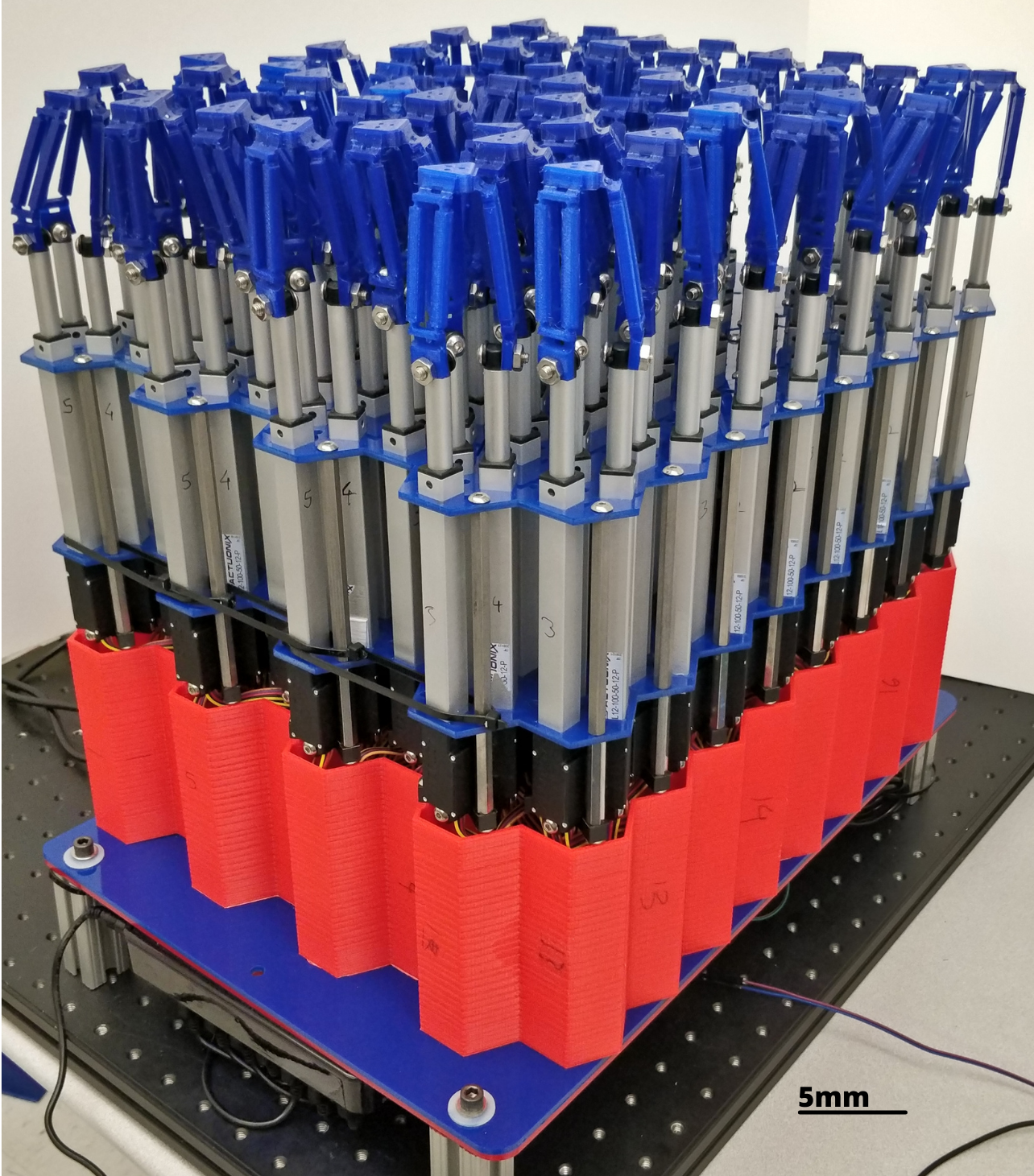 翻译:本文展示了一种新型分布式三角形操纵器的新类型: 三角形阵列。 每个三角体阵列包含一个有符合 3D 打印的平行图象链接的线性活性三角形机器人网格。 这些阵列可用于执行平面运输任务, 类似于智能传送器。 然而, 三角体的额外自由度也提供了各种各样的飞机外操纵, 以及三角形各组之间的先发性操纵。 一个三角体阵列因此提供了范围广泛的分布式操纵策略。 在本文件中, 我们展示了三角体阵列的设计, 包括单个三角体、 模块阵列结构以及分布式通信和控制。 我们还利用拟议的设计构建和评估了 8x8 阵列。 我们的评估显示, 由此形成的 192 DoF 机器人能够对各种天体进行各种协调的分布式操纵, 包括翻译、 校正和 前置式阵列阵列。