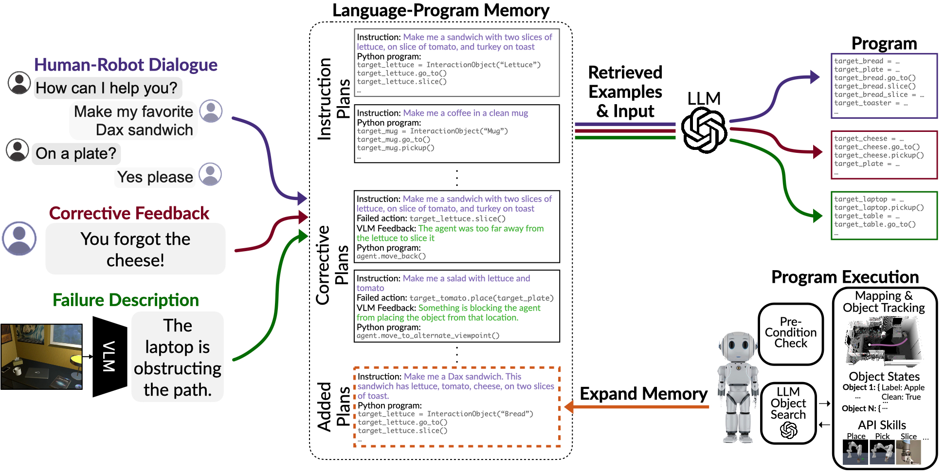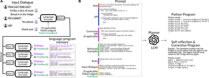Pre-trained and frozen LLMs can effectively map simple scene re-arrangement instructions to programs over a robot's visuomotor functions through appropriate few-shot example prompting. To parse open-domain natural language and adapt to a user's idiosyncratic procedures, not known during prompt engineering time, fixed prompts fall short. In this paper, we introduce HELPER, an embodied agent equipped with an external memory of language-program pairs that parses free-form human-robot dialogue into action programs through retrieval-augmented LLM prompting: relevant memories are retrieved based on the current dialogue, instruction, correction or VLM description, and used as in-context prompt examples for LLM querying. The memory is expanded during deployment to include pairs of user's language and action plans, to assist future inferences and personalize them to the user's language and routines. HELPER sets a new state-of-the-art in the TEACh benchmark in both Execution from Dialog History (EDH) and Trajectory from Dialogue (TfD), with 1.7x improvement over the previous SOTA for TfD. Our models, code and video results can be found in our project's website: https://helper-agent-llm.github.io.