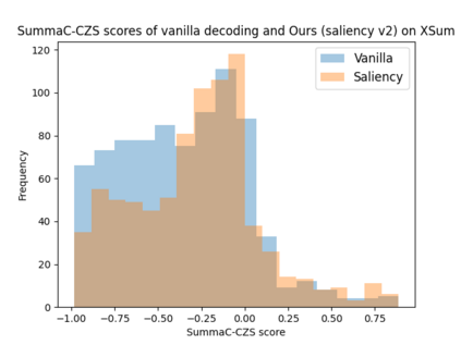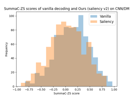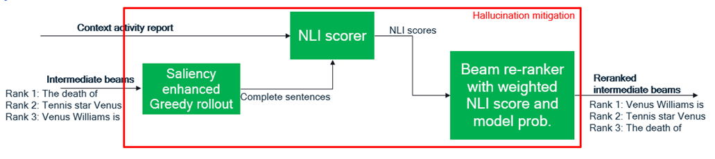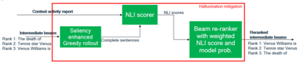Advancement in large pretrained language models has significantly improved their performance for conditional language generation tasks including summarization albeit with hallucinations. To reduce hallucinations, conventional methods proposed improving beam search or using a fact checker as a postprocessing step. In this paper, we investigate the use of the Natural Language Inference (NLI) entailment metric to detect and prevent hallucinations in summary generation. We propose an NLI-assisted beam re-ranking mechanism by computing entailment probability scores between the input context and summarization model-generated beams during saliency-enhanced greedy decoding. Moreover, a diversity metric is introduced to compare its effectiveness against vanilla beam search. Our proposed algorithm significantly outperforms vanilla beam decoding on XSum and CNN/DM datasets.