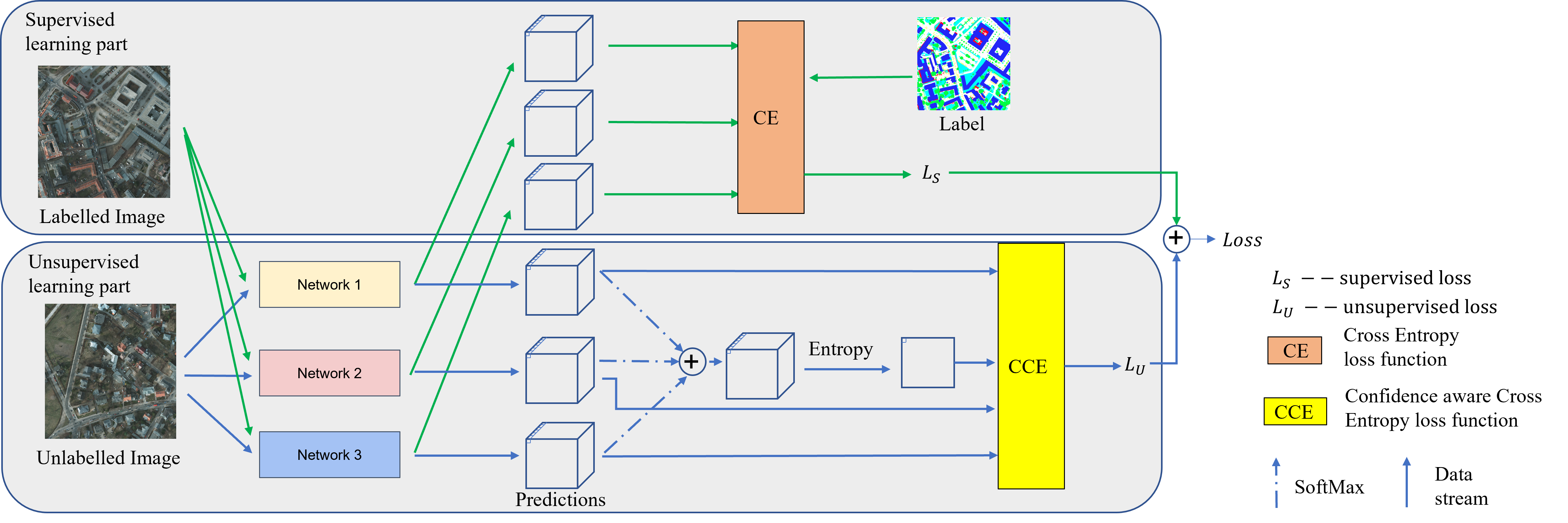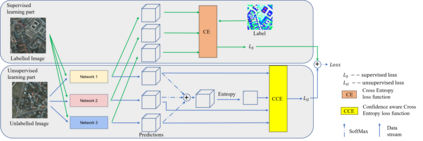 Semi-supervised learning has been well developed to help reduce the cost of manual labelling by exploiting a large quantity of unlabelled data. Especially in the application of land cover classification, pixel-level manual labelling in large-scale imagery is labour-intensive and expensive. However, the existing semi-supervised learning methods pay limited attention to the quality of pseudo-labels whilst supervising the network. That is, nevertheless, one of the critical factors determining network performance. In order to fill this gap, we develop a confidence-guided semi-supervised learning (CGSSL) approach to make use of high-confidence pseudo labels and reduce the negative effect of low-confidence ones on training the land cover classification network. Meanwhile, the proposed semi-supervised learning approach uses multiple network architectures to increase pseudo-label diversity. The proposed semi-supervised learning approach significantly improves the performance of land cover classification compared to the classical semi-supervised learning methods in computer vision and even outperforms fully supervised learning with a complete set of labelled imagery of the benchmark Potsdam land cover data set.