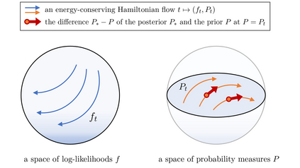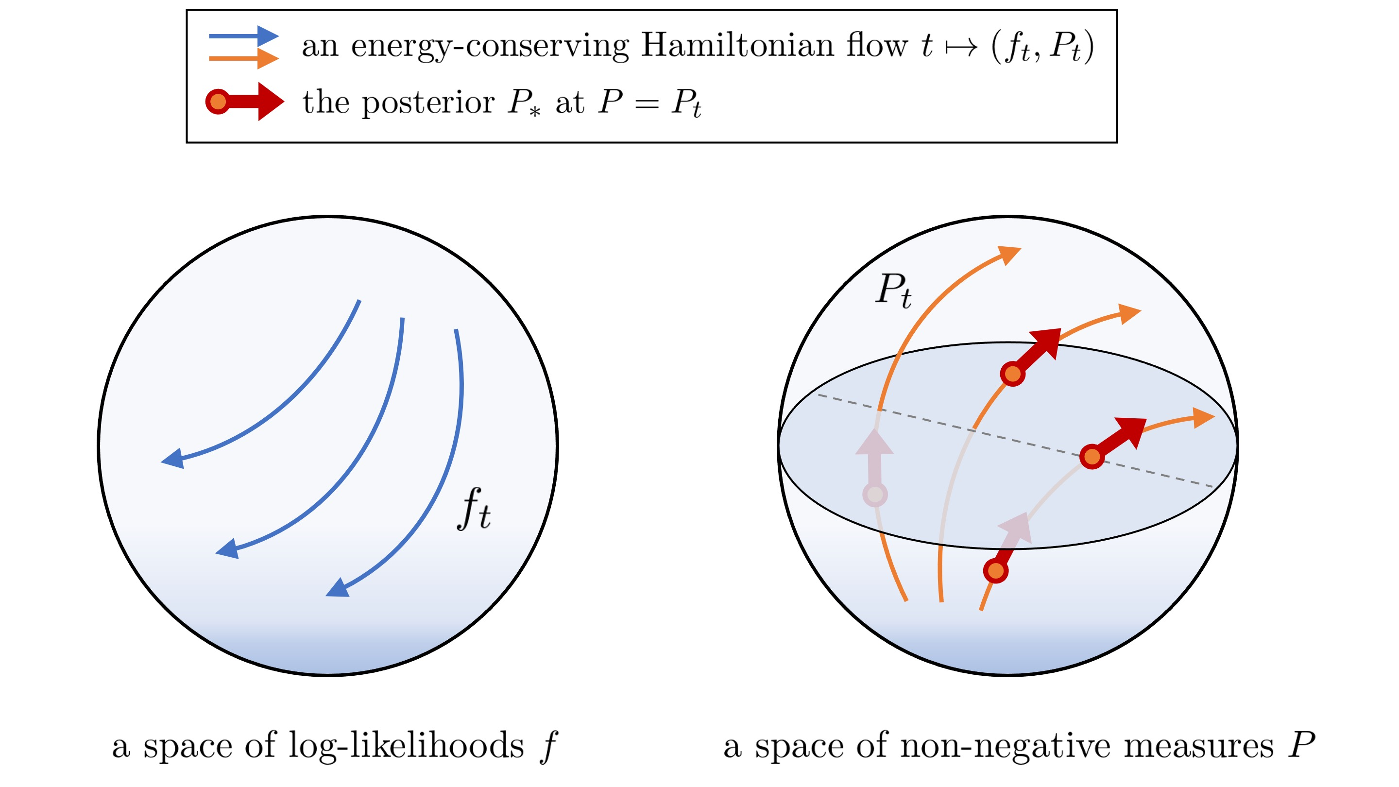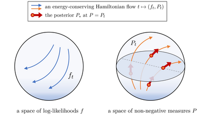 This paper makes two theoretical contributions. First, we establish a novel class of Hamiltonian systems, called arc Hamiltonian systems, for saddle Hamiltonian functions over infinite-dimensional metric spaces. Arc Hamiltonian systems generate a flow that satisfies the law of conservation of energy everywhere in a metric space. They are governed by an extension of Hamilton's equation formulated based on (i) the framework of arc fields and (ii) an infinite-dimensional gradient, termed the arc gradient, of a Hamiltonian function. We derive conditions for the existence of a flow generated by an arc Hamiltonian system, showing that they reduce to local Lipschitz continuity of the arc gradient under sufficient regularity. Second, we present two Hamiltonian functions, called the cumulant generating functional and the centred cumulant generating functional, over a metric space of log-likelihoods and measures. The former characterises the posterior of Bayesian inference as a part of the arc gradient that induces a flow of log-likelihoods and non-negative measures. The latter characterises the difference of the posterior and the prior as a part of the arc gradient that induces a flow of log-likelihoods and probability measures. Our results reveal an implication of the belief updating mechanism from the prior to the posterior as an infinitesimal change of a measure in the infinite-dimensional Hamiltonian flows.