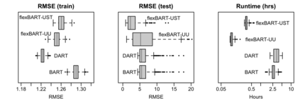 翻译:Bayesian Additive Regression 树(BART) 的默认执行代表了使用数种二进制指标的绝对预测值, 每个绝对预测器的每个级别各有一个。 以这些指标建造的倒退树使用“ 重新移动一个时间战略” 来分隔水平 。 不幸的是, 绝大多数水平分区无法用这个战略来构建, 严重限制了 BAART 在各个层次上“ 浏览力” 的能力。 我们克服了这一限制, 我们用一个新的回归树类别和之前的新决定规则, 可以给决定节点的左边和右边的孩子分配多个级别。 受区域空间应用的驱动, 以等数据为动力, 我们引入了进一步的决定规则, 将区域分割到空间毗连区域, 将随机横贯的、 适当界定的网络的树木的边缘从边緣分割出来 。 我们在弹性BARTART包中实施了我们新的回归树前的边缘, 与现有的执行相比, 通常在不增加计算负担的情况下, 产生更好的超量的预测性功能。 我们用棒球和偏向犯罪模型来展示LiveBAT的功效。
