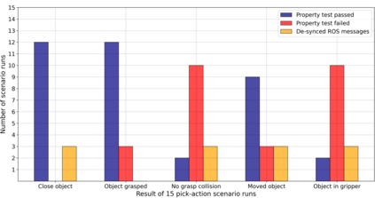 翻译:服务机器人的可靠性和稳健性的一个重要先决条件是确保机器人在从事各种感兴趣的任务时的正确行为。 广泛测试是确保行为正确性的一种既定方法;随着学习方法融入机器人软件结构,这一点变得更加重要,因为往往无法从理论上保证在各种情况下采用这种方法。 在本文中,我们的目标是通过自动生成模拟测试情景来评价桌面操作中的机器人行为的正确性,机器人在其中使用基于属性的测试来评估其性能。特别是,各种机器人行为的主要利益特性在一种肿瘤学行动中被编码,然后在模拟环境中进行验证和验证。我们用丰田人类支持机器人(HSR)来评估我们的框架,该机器人在加泽博模拟中测试。我们表明,我们的框架可以正确和一致地识别在各种随机化桌面操纵情景中的各种失败行为,此外还能更深入地了解每个设计属性的失败类型和地点。
