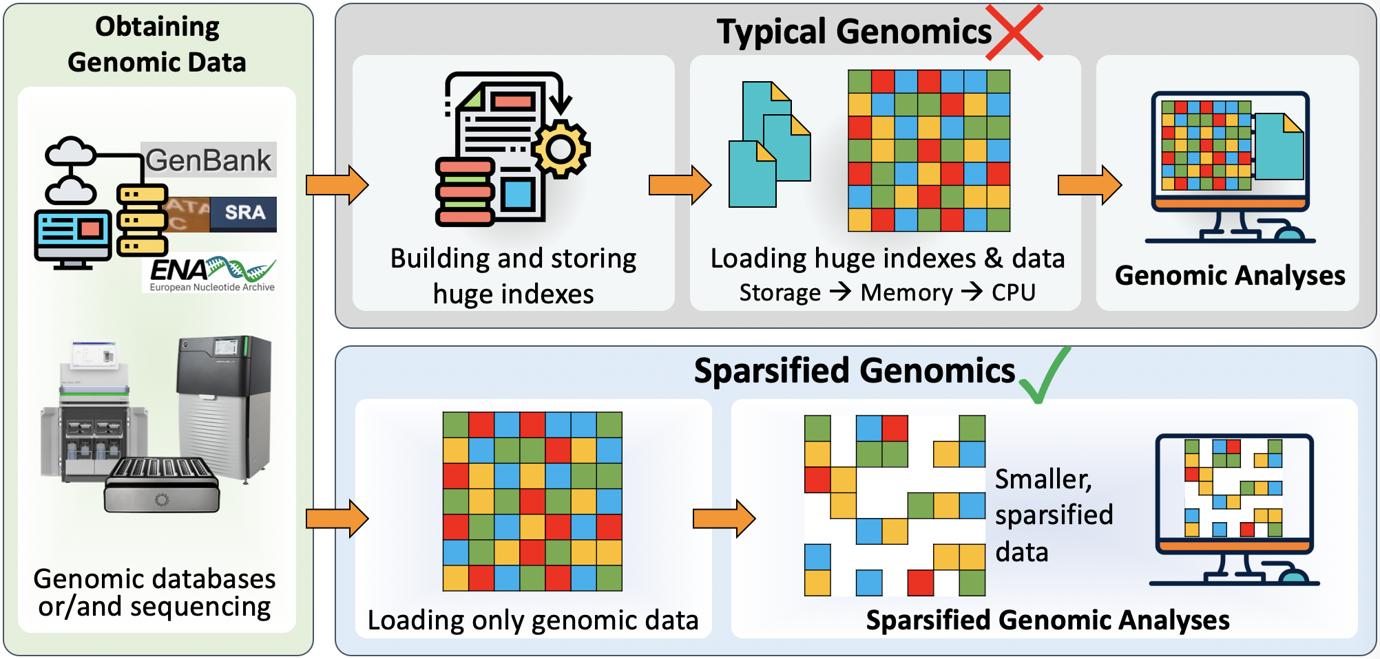 Searching for similar genomic sequences is an essential and fundamental step in biomedical research and an overwhelming majority of genomic analyses. State-of-the-art computational methods performing such comparisons fail to cope with the exponential growth of genomic sequencing data. We introduce the concept of sparsified genomics where we systematically exclude a large number of bases from genomic sequences and enable much faster and more memory-efficient processing of the sparsified, shorter genomic sequences, while providing similar or even higher accuracy compared to processing non-sparsified sequences. Sparsified genomics provides significant benefits to many genomic analyses and has broad applicability. We show that sparsifying genomic sequences greatly accelerates the state-of-the-art read mapper (minimap2) by 2.57-5.38x, 1.13-2.78x, and 3.52-6.28x using real Illumina, HiFi, and ONT reads, respectively, while providing up to 2.1x smaller memory footprint, 2x smaller index size, and more truly detected small and structural variations compared to minimap2. Sparsifying genomic sequences makes containment search through very large genomes and very large databases 72.7-75.88x faster and 723.3x more storage-efficient than searching through non-sparsified genomic sequences (with CMash and KMC3). Sparsifying genomic sequences enables robust microbiome discovery by providing 54.15-61.88x faster and 720x more storage-efficient taxonomic profiling of metagenomic samples over the state-of-art tool (Metalign). We design and open-source a framework called Genome-on-Diet as an example tool for sparsified genomics, which can be freely downloaded from https://github.com/CMU-SAFARI/Genome-on-Diet.