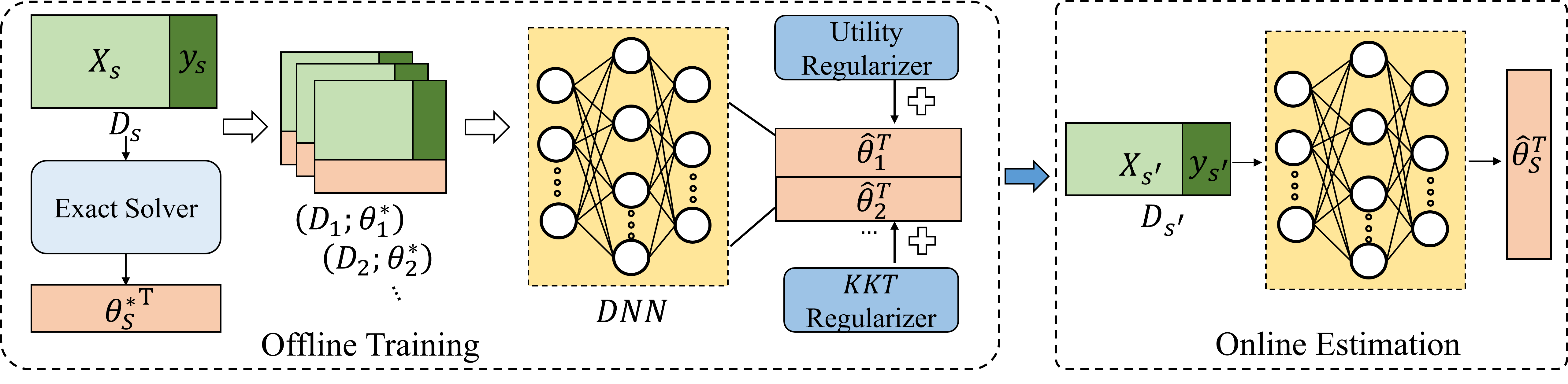 Machine learning (ML) models need to be frequently retrained on changing datasets in a wide variety of application scenarios, including data valuation and uncertainty quantification. To efficiently retrain the model, linear approximation methods such as influence function have been proposed to estimate the impact of data changes on model parameters. However, these methods become inaccurate for large dataset changes. In this work, we focus on convex learning problems and propose a general framework to learn to estimate optimized model parameters for different training sets using neural networks. We propose to enforce the predicted model parameters to obey optimality conditions and maintain utility through regularization techniques, which significantly improve generalization. Moreover, we rigorously characterize the expressive power of neural networks to approximate the optimizer of convex problems. Empirical results demonstrate the advantage of the proposed method in accurate and efficient model parameter estimation compared to the state-of-the-art.