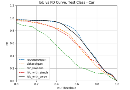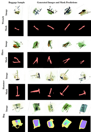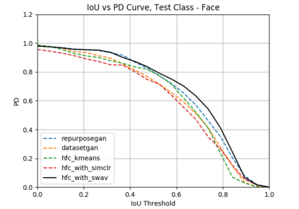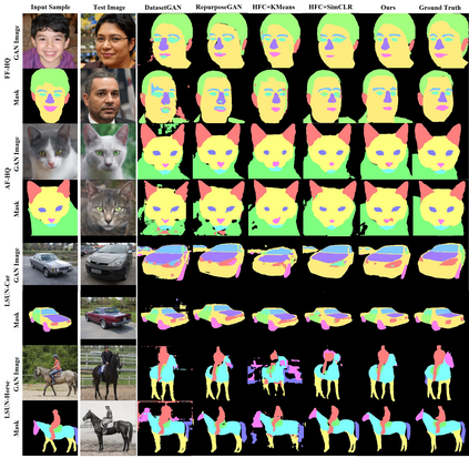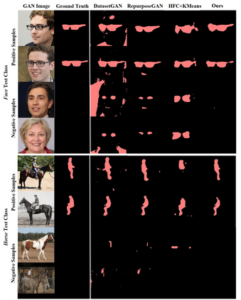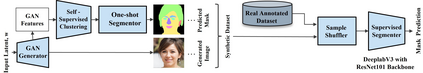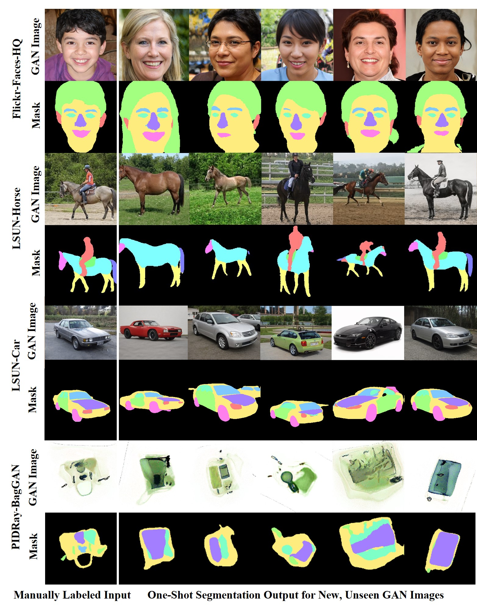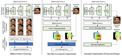 We propose a framework for the automatic one-shot segmentation of synthetic images generated by a StyleGAN. Our framework is based on the observation that the multi-scale hidden features in the GAN generator hold useful semantic information that can be utilized for automatic on-the-fly segmentation of the generated images. Using these features, our framework learns to segment synthetic images using a self-supervised contrastive clustering algorithm that projects the hidden features into a compact space for per-pixel classification. This contrastive learner is based on using a novel data augmentation strategy and a pixel-wise swapped prediction loss that leads to faster learning of the feature vectors for one-shot segmentation. We have tested our implementation on five standard benchmarks to yield a segmentation performance that not only outperforms the semi-supervised baselines by an average wIoU margin of 1.02 % but also improves the inference speeds by a factor of 4.5. Finally, we also show the results of using the proposed one-shot learner in implementing BagGAN, a framework for producing annotated synthetic baggage X-ray scans for threat detection. This framework was trained and tested on the PIDRay baggage benchmark to yield a performance comparable to its baseline segmenter based on manual annotations.