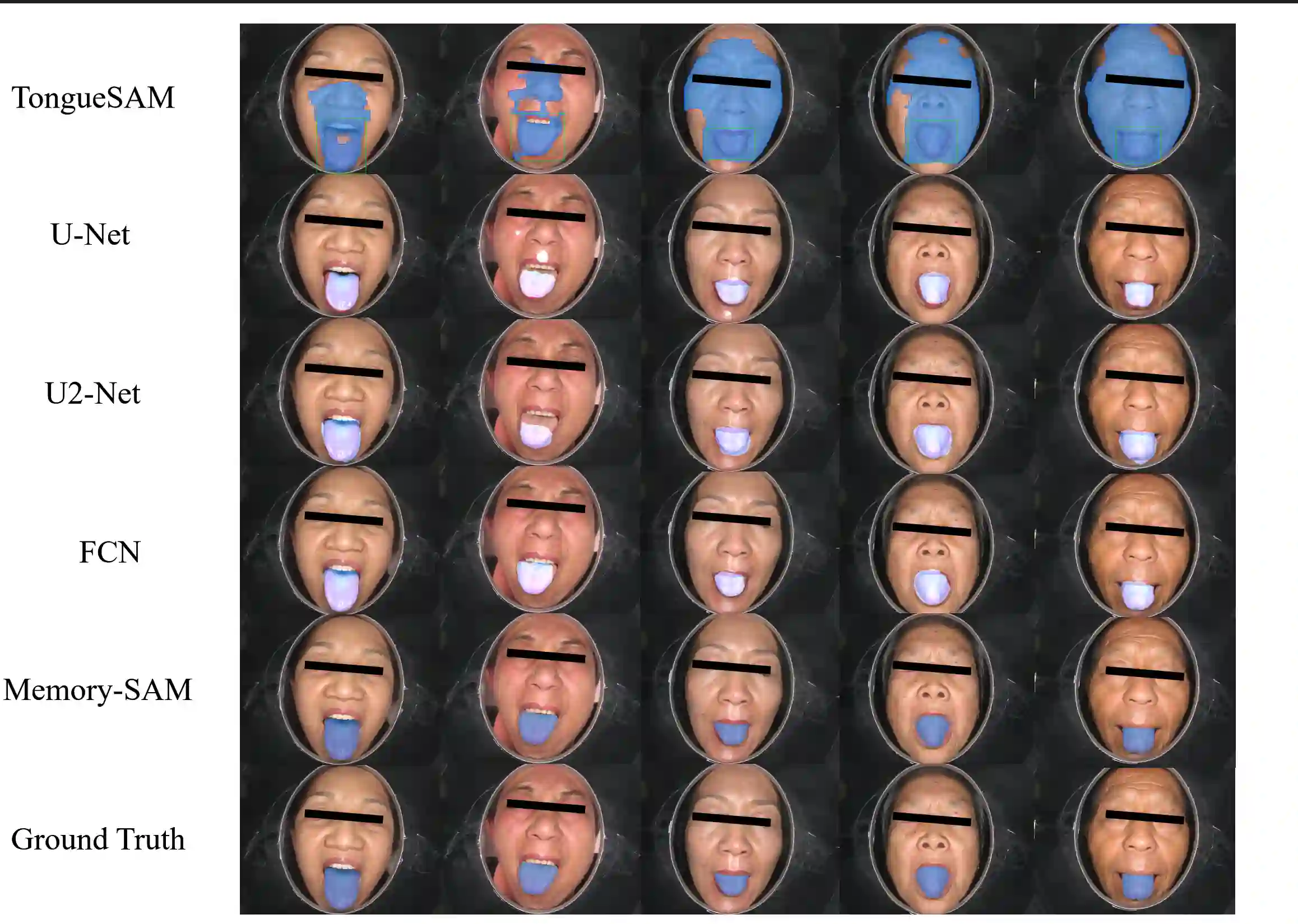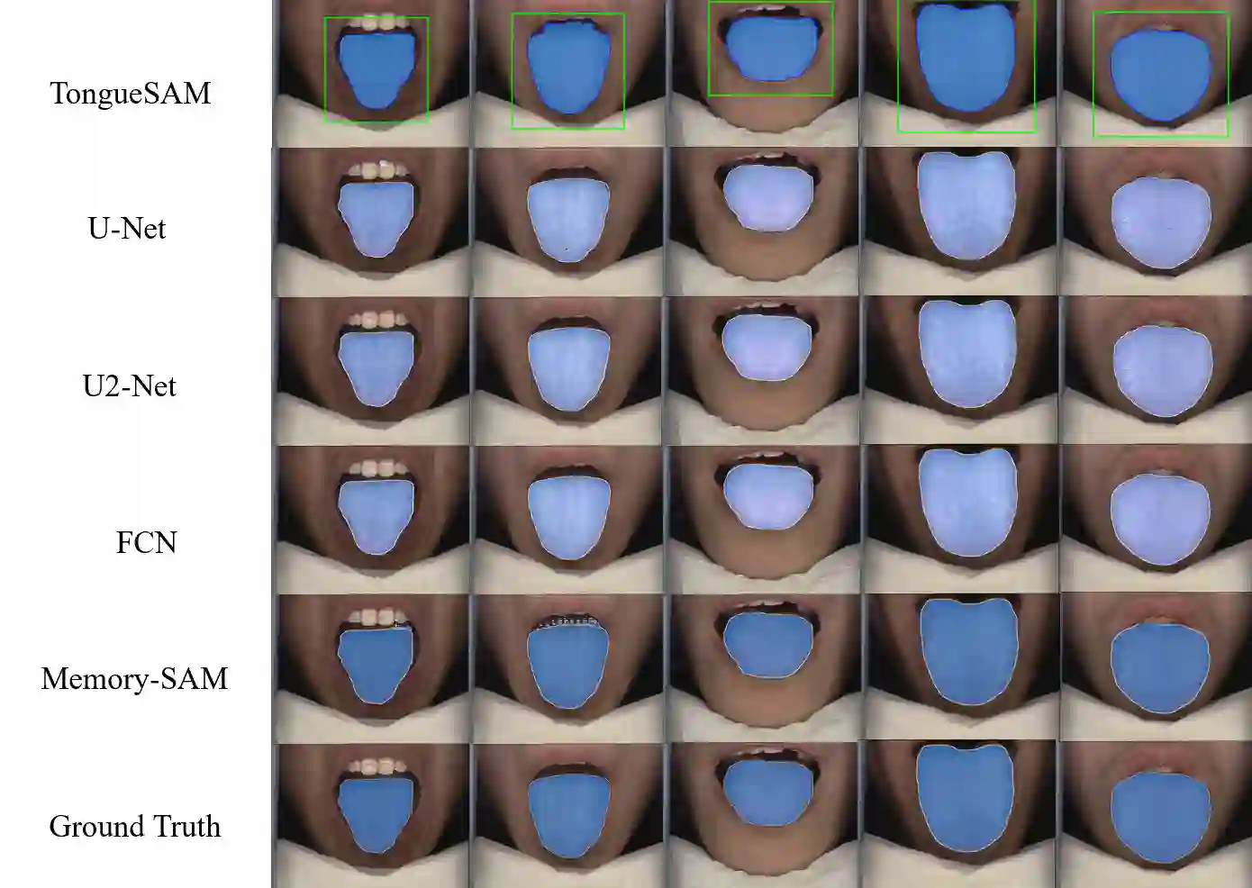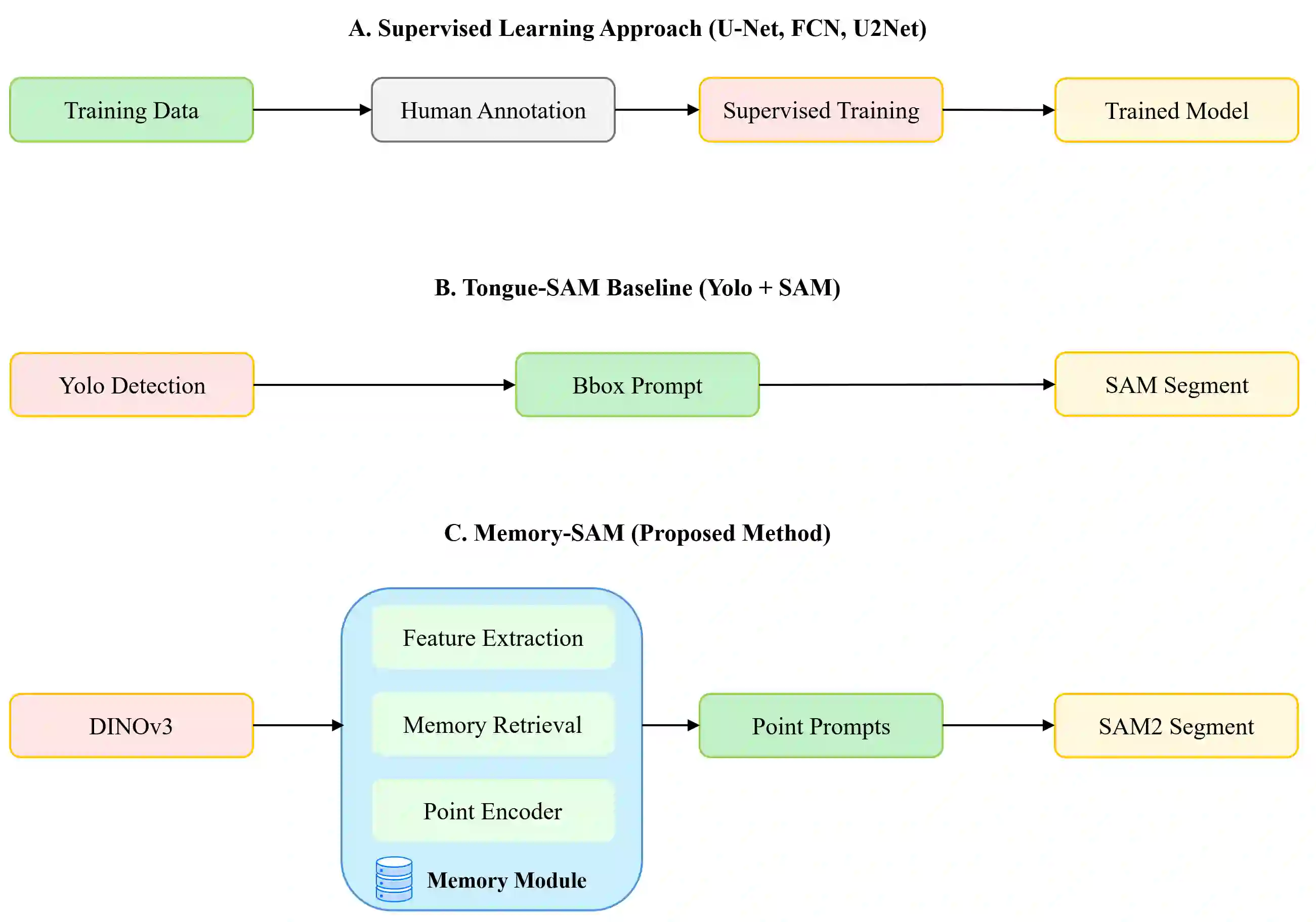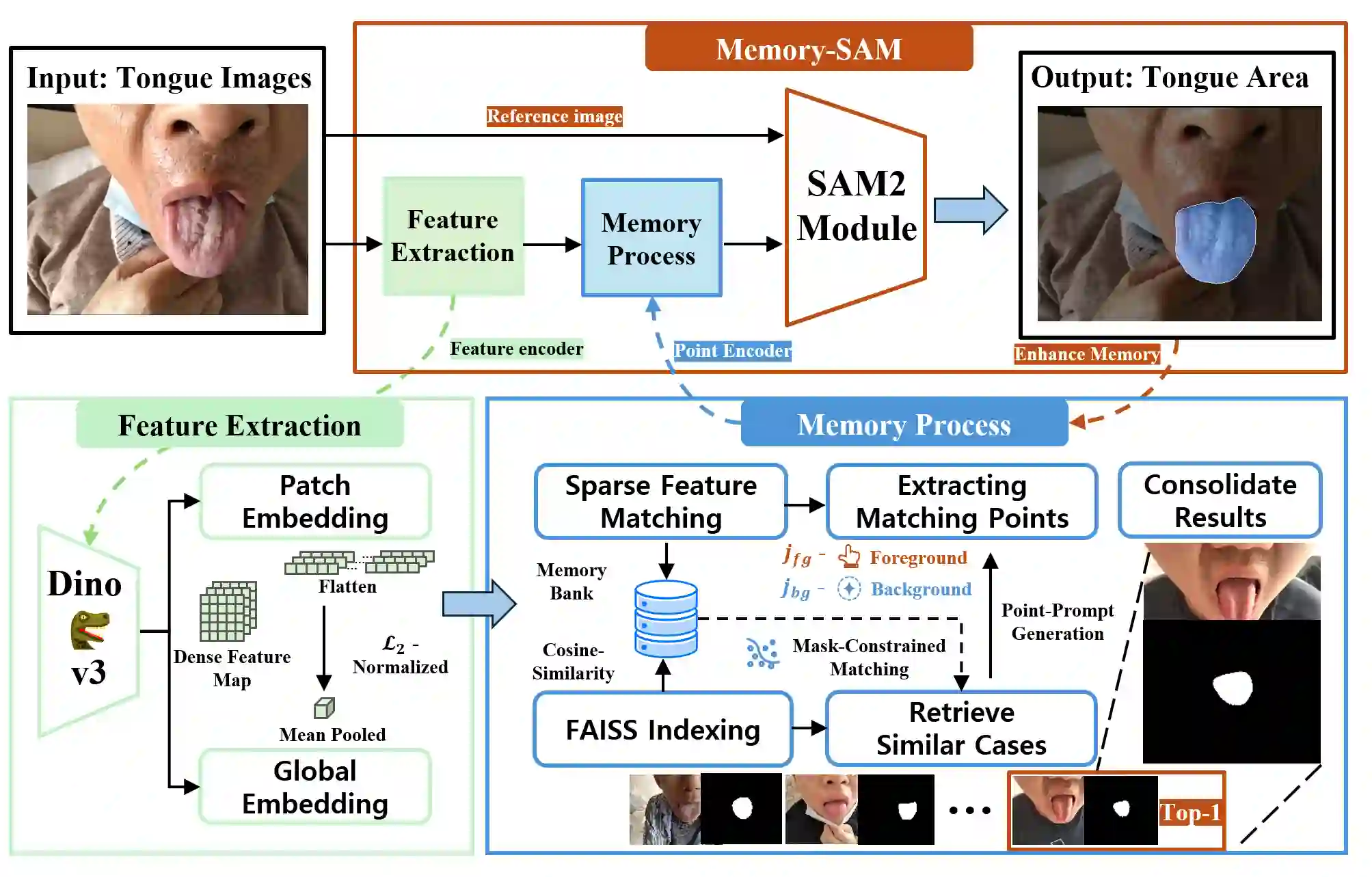 Accurate tongue segmentation is crucial for reliable TCM analysis. Supervised models require large annotated datasets, while SAM-family models remain prompt-driven. We present Memory-SAM, a training-free, human-prompt-free pipeline that automatically generates effective prompts from a small memory of prior cases via dense DINOv3 features and FAISS retrieval. Given a query image, mask-constrained correspondences to the retrieved exemplar are distilled into foreground/background point prompts that guide SAM2 without manual clicks or model fine-tuning. We evaluate on 600 expert-annotated images (300 controlled, 300 in-the-wild). On the mixed test split, Memory-SAM achieves mIoU 0.9863, surpassing FCN (0.8188) and a detector-to-box SAM baseline (0.1839). On controlled data, ceiling effects above 0.98 make small differences less meaningful given annotation variability, while our method shows clear gains under real-world conditions. Results indicate that retrieval-to-prompt enables data-efficient, robust segmentation of irregular boundaries in tongue imaging. The code is publicly available at https://github.com/jw-chae/memory-sam.