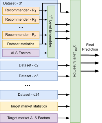 This paper describes the solution of our team PolimiRank for the WSDM Cup 2022 on cross-market recommendation. The goal of the competition is to effectively exploit the information extracted from different markets to improve the ranking accuracy of recommendations on two target markets. Our model consists in a multi-stage approach based on the combination of data belonging to different markets. In the first stage, state-of-the-art recommenders are used to predict scores for user-item couples, which are ensembled in the following 2 stages, employing a simple linear combination and more powerful Gradient Boosting Decision Tree techniques. Our team ranked 4th in the final leaderboard.