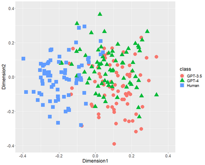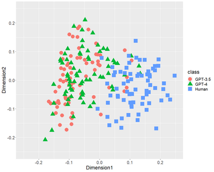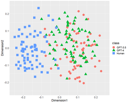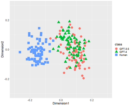 翻译:文本生成的人工智能(ChatGPT),包括OpenAI的GPT-3.5和GPT-4,已经在全球范围内引起了极大的关注。本研究首先比较了由GPT(-3.5和-4)生成的日语文体特征和人类写作的文体特征。本研究采用多维缩放(MDS)分析来确认三类216篇文本(36位单一作者撰写的72篇学术论文、基于前述论文标题生成的72篇GPT-3.5文本和72篇GPT-4文本)的分布情况,侧重以下文体特征: (1) 词性二元组,(2) 助词二元组,(3) 逗号位置,和 (4) 功能词比率。MDS 揭示了 GPT(-3.5和-4)生成文本和人类写作文本在每个文体特征上都有明显不同的分布。虽然 GPT-4 比 GPT-3.5 功率更大,因为它具有更多的参数,但是 GPT(-3.5和-4) 的分布可能会发生重叠。这些结果表明虽然未来参数数量可能会增加,但是在文体特征方面,人工智能生成的文本可能与人类撰写的文本不会接近。其次,我们通过随机森林(RF)分类器验证了以文体特征为中心的两类(GPT和人类)分类性能,本研究揭示了每种文体特征的高性能RF分类器。此外,以功能词比率为中心的RF分类器达到98.1%的准确率,以全部文体特征为中心的RF分类器在所有性能指标(准确率、召回率、精确率和 F1 分数)上达到了100%。本研究的结论是,在目前这个阶段,以日语为例,我们人类可以区分 ChatGPT 和人类撰写的文本。