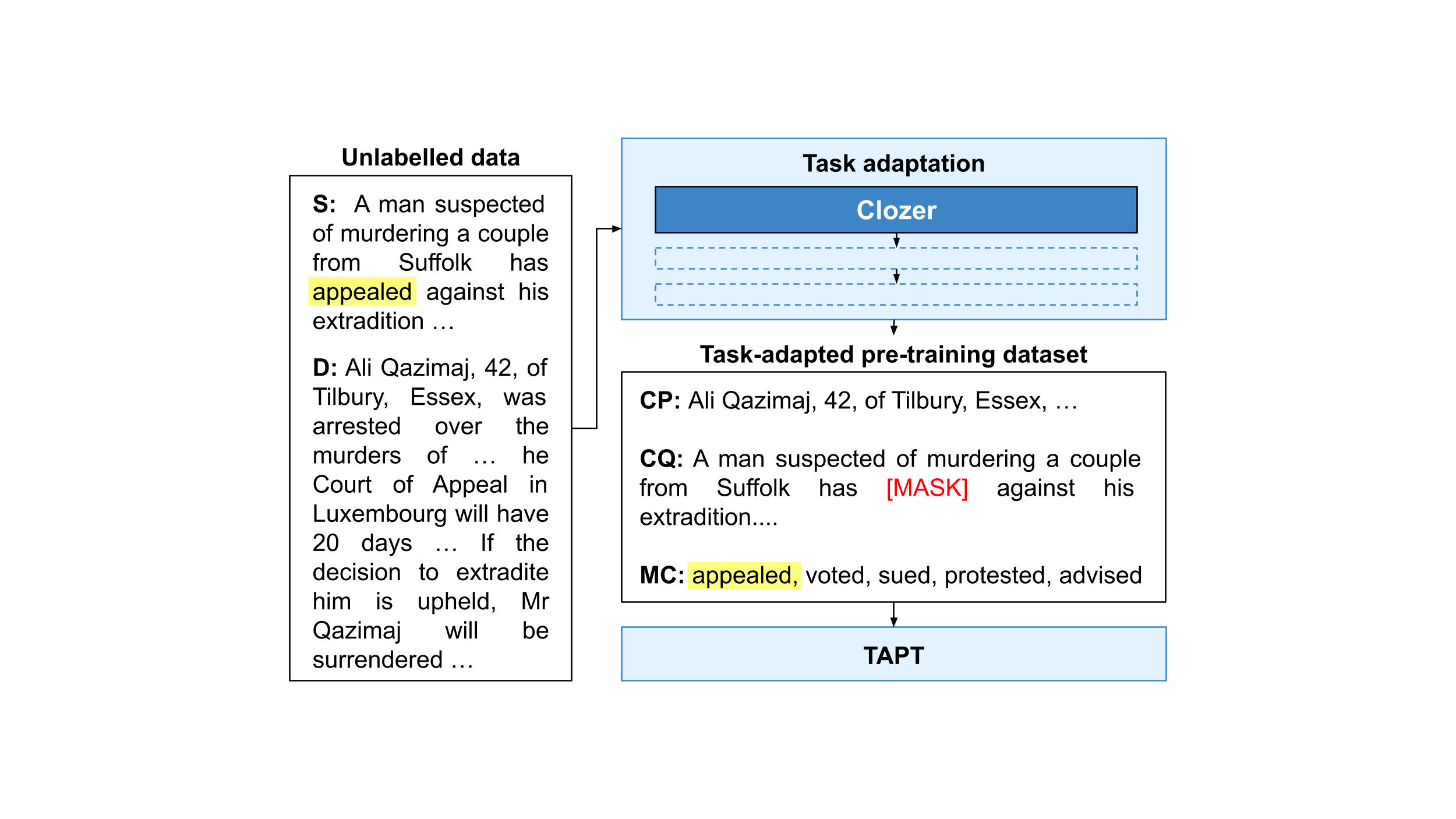 Task-adaptive pre-training (TAPT) alleviates the lack of labelled data and provides performance lift by adapting unlabelled data to downstream task. Unfortunately, existing adaptations mainly involve deterministic rules that cannot generalize well. Here, we propose Clozer, a sequence-tagging based cloze answer extraction method used in TAPT that is extendable for adaptation on any cloze-style machine reading comprehension (MRC) downstream tasks. We experiment on multiple-choice cloze-style MRC tasks, and show that Clozer performs significantly better compared to the oracle and state-of-the-art in escalating TAPT effectiveness in lifting model performance, and prove that Clozer is able to recognize the gold answers independently of any heuristics.