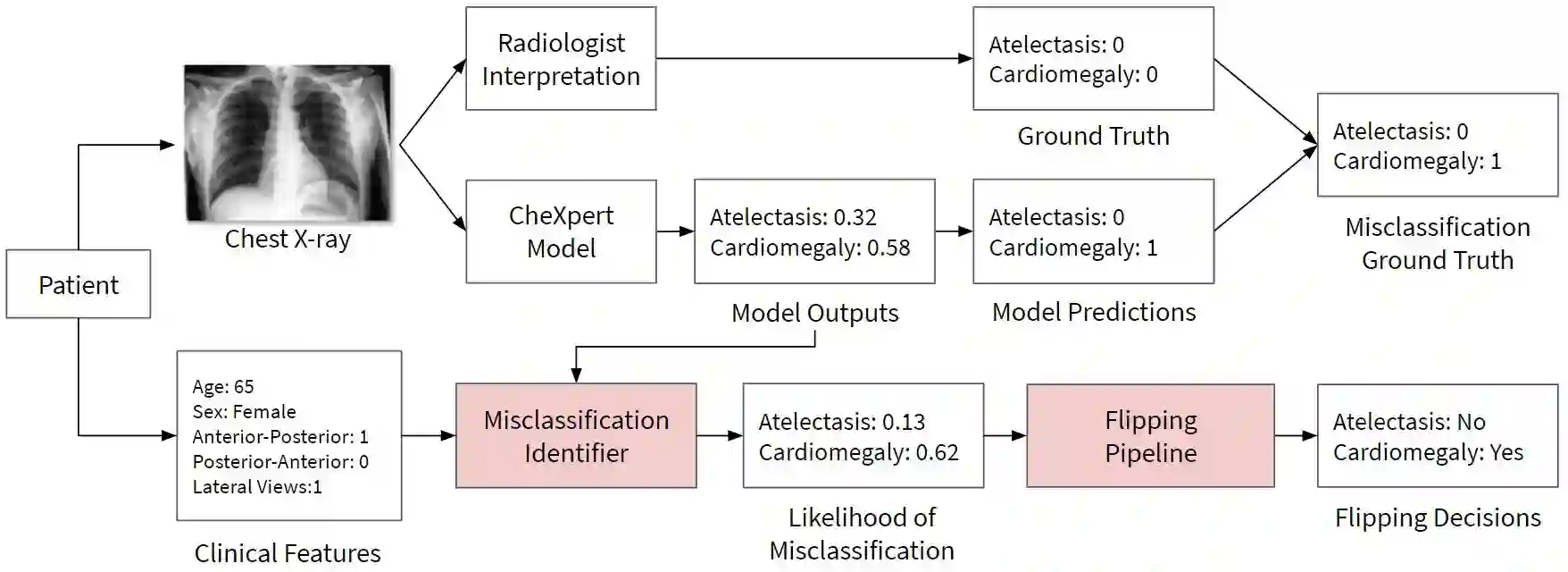 翻译:将胸前X射线解释的深学习模型纳入临床环境的一个主要障碍是缺乏对其失败模式的理解。在这项工作中,我们首先调查是否有胸前X射线模型可能错误分类的病人分组;我们发现,病人年龄和肺损伤、肺炎球菌或辅助装置的放射调查结果是预测某些胸前X射线模型错误分类的统计相关特征;第二,我们利用胸部X射线模型的产出和临床特征,在胸前X射线模型上开发错误分类预测器。我们发现,我们最能执行的分类错误识别器在大多数疾病上达到接近0.9的AUROC。第三,我们使用错误分类识别器,我们开发了一种纠正算法,选择在发酵时极有可能发生错误分类的翻转模型预测。我们观察到,对合并预测(0.008 [95% CI0.005, 0.010] 和爱德马(0.003,[95% CI0.001,0.006] )的F1改进了。我们通过对10个独特和高性胸透的X射线模型进行调查,我们能够了解其他可应用的图像框架。