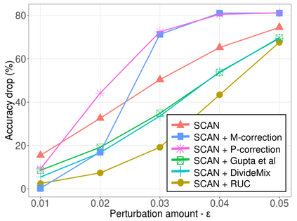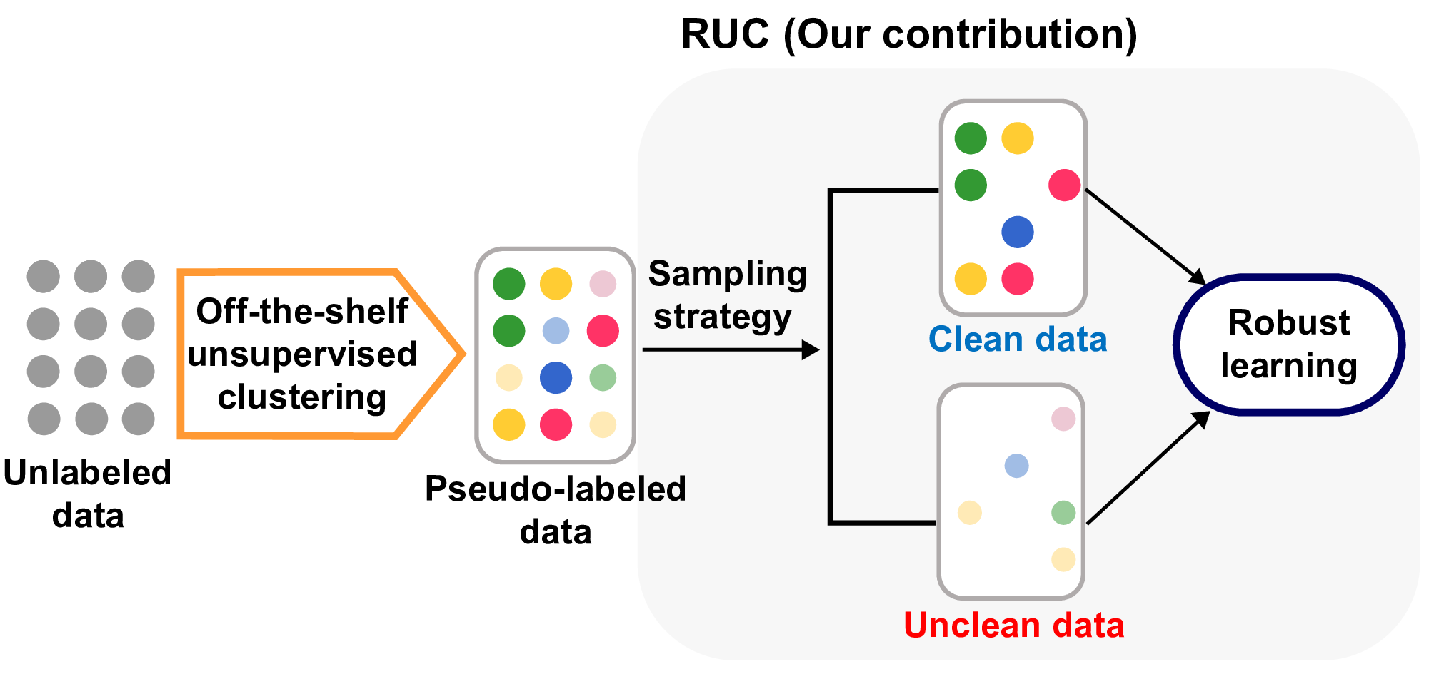 Unsupervised image clustering methods often introduce alternative objectives to indirectly train the model and are subject to faulty predictions and overconfident results. To overcome these challenges, the current research proposes an innovative model RUC that is inspired by robust learning. RUC's novelty is at utilizing pseudo-labels of existing image clustering models as a noisy dataset that may include misclassified samples. Its retraining process can revise misaligned knowledge and alleviate the overconfidence problem in predictions. The model's flexible structure makes it possible to be used as an add-on module to other clustering methods and helps them achieve better performance on multiple datasets. Extensive experiments show that the proposed model can adjust the model confidence with better calibration and gain additional robustness against adversarial noise.