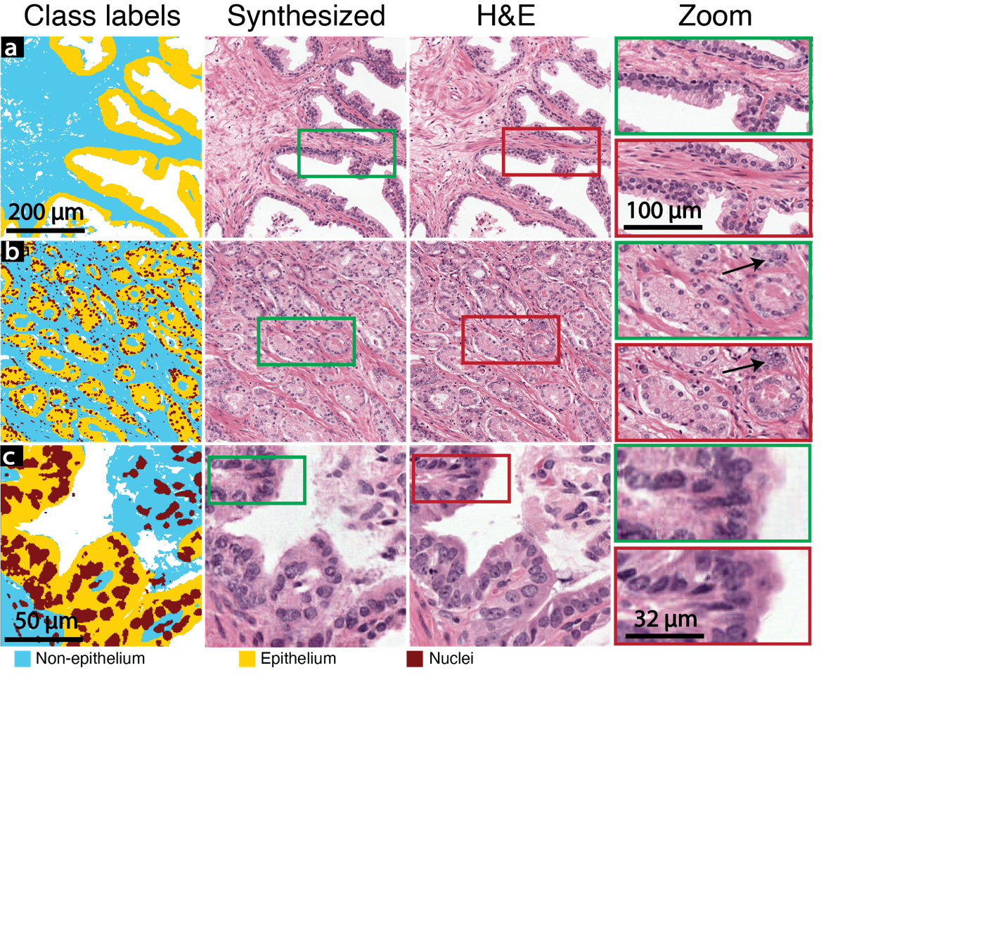 An optical microscopic examination of thinly cut stained tissue on glass slides prepared from a FFPE tissue blocks is the gold standard for tissue diagnostics. In addition, the diagnostic abilities and expertise of any pathologist is dependent on their direct experience with common as well as rarer variant morphologies. Recently, deep learning approaches have been used to successfully show a high level of accuracy for such tasks. However, obtaining expert-level annotated images is an expensive and time-consuming task and artificially synthesized histological images can prove greatly beneficial. Here, we present an approach to not only generate histological images that reproduce the diagnostic morphologic features of common disease but also provide a user ability to generate new and rare morphologies. Our approach involves developing a generative adversarial network model that synthesizes pathology images constrained by class labels. We investigated the ability of this framework in synthesizing realistic prostate and colon tissue images and assessed the utility of these images in augmenting diagnostic ability of machine learning methods as well as their usability by a panel of experienced anatomic pathologists. Synthetic data generated by our framework performed similar to real data in training a deep learning model for diagnosis. Pathologists were not able to distinguish between real and synthetic images and showed a similar level of inter-observer agreement for prostate cancer grading. We extended the approach to significantly more complex images from colon biopsies and showed that the complex microenvironment in such tissues can also be reproduced. Finally, we present the ability for a user to generate deepfake histological images via a simple markup of sematic labels.