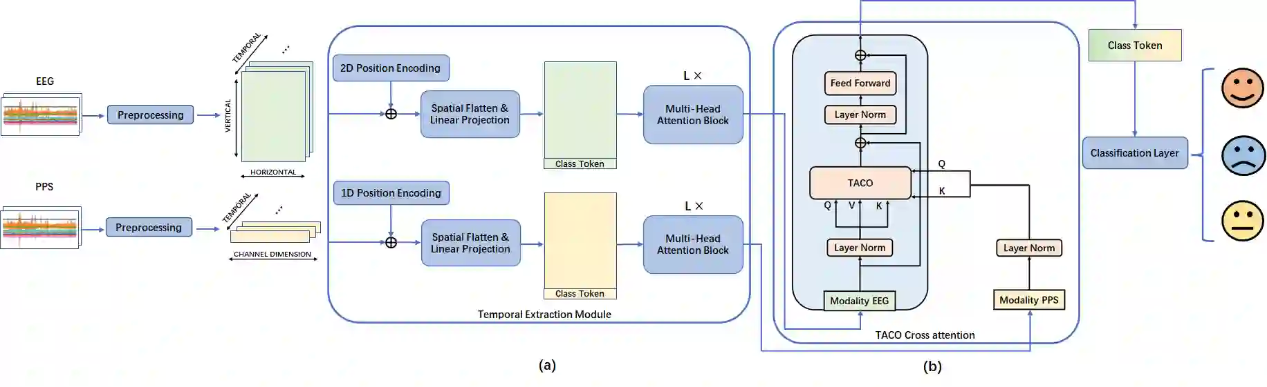 Recently, emotion recognition based on physiological signals has emerged as a field with intensive research. The utilization of multi-modal, multi-channel physiological signals has significantly improved the performance of emotion recognition systems, due to their complementarity. However, effectively integrating emotion-related semantic information from different modalities and capturing inter-modal dependencies remains a challenging issue. Many existing multimodal fusion methods ignore either token-to-token or channel-to-channel correlations of multichannel signals from different modalities, which limits the classification capability of the models to some extent. In this paper, we propose a comprehensive perspective of multimodal fusion that integrates channel-level and token-level cross-modal interactions. Specifically, we introduce a unified cross attention module called Token-chAnnel COmpound (TACO) Cross Attention to perform multimodal fusion, which simultaneously models channel-level and token-level dependencies between modalities. Additionally, we propose a 2D position encoding method to preserve information about the spatial distribution of EEG signal channels, then we use two transformer encoders ahead of the fusion module to capture long-term temporal dependencies from the EEG signal and the peripheral physiological signal, respectively. Subject-independent experiments on emotional dataset DEAP and Dreamer demonstrate that the proposed model achieves state-of-the-art performance.