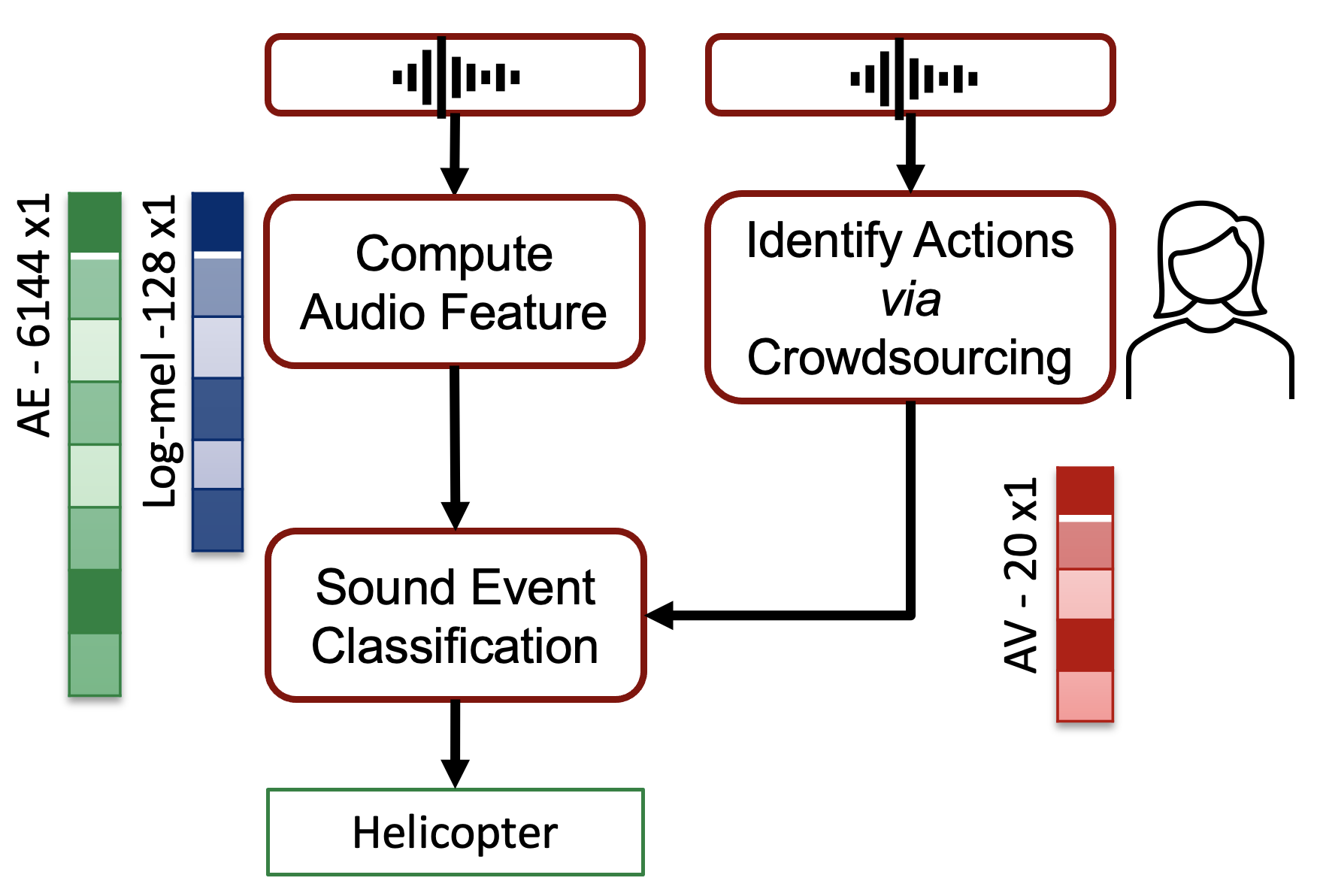 翻译:在心理学中,行动是人类感知和分离声音事件的首要因素。在机器学习(ML)中,行动识别达到高度准确性;然而,没有询问确定行动是否有利于健康事件分类(SEC),而不是将音频直接映射到一个声音事件。因此,我们为SEC提出一种新的具有心理学启发性的方法,其中包括通过人类听众识别行动。为实现这一目标,我们利用众包让听众识别20个单独或组合在研究周密的数据集ESC-50中可能产生50个声音事件的任何一个动作。由于音频特征和AV收集了声音内容的不同抽象性,我们把每个音频记录与第一个时间的音频事件数据库联系起来,在修订后将发布。这些说明被用来创建被称为“行动矢量”的语义表。我们通过将AV与两种类型的音频特征 -- -- log-mel 光谱和艺术音频嵌入状态 -- -- 比较来评价SEC。由于音频特征和AV收集了不同音频内容的抽象性,我们把它们合并起来,并在ESC-50最高级方法中展示了它们(86)改进了。